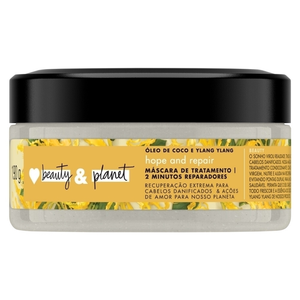 o A linha Hope & Repair de Love Beauty and Planet, criada com óleo de coco orgânico e ylang ylang, possui o tratamento completo para a reparação do cabelo danificado. o Desfrute do exótico frescor do óleo da flor de Ylang Ylang cultivada de forma consciente e sustentável na ilha de Comores. o Essa incrível máscara de tratamento com óleo de coco orgânico nutre e ajuda na recuperação extrema do seu cabelo. Isso quer dizer: menos pontas duplas, mais maciez, mais brilho e cabelo mais saudável. o A fórmula de Hope & Repair é vegana e não testada em animais. Além disso, é livre de Parabenos, Silicones e Corantes. o Nossos frascos não são tão transparentes, pois são feitos de plástico 100% reciclado. Eles também são recicláveis, assim causamos menos impacto no meio ambiente. o Nós acreditamos que você não precisa abrir mão de ficar bonita para cuidar do planeta. Por isso, Love Beauty & Planet incentiva suas consumidoras a fazerem pequena ações de amor pelo planeta!