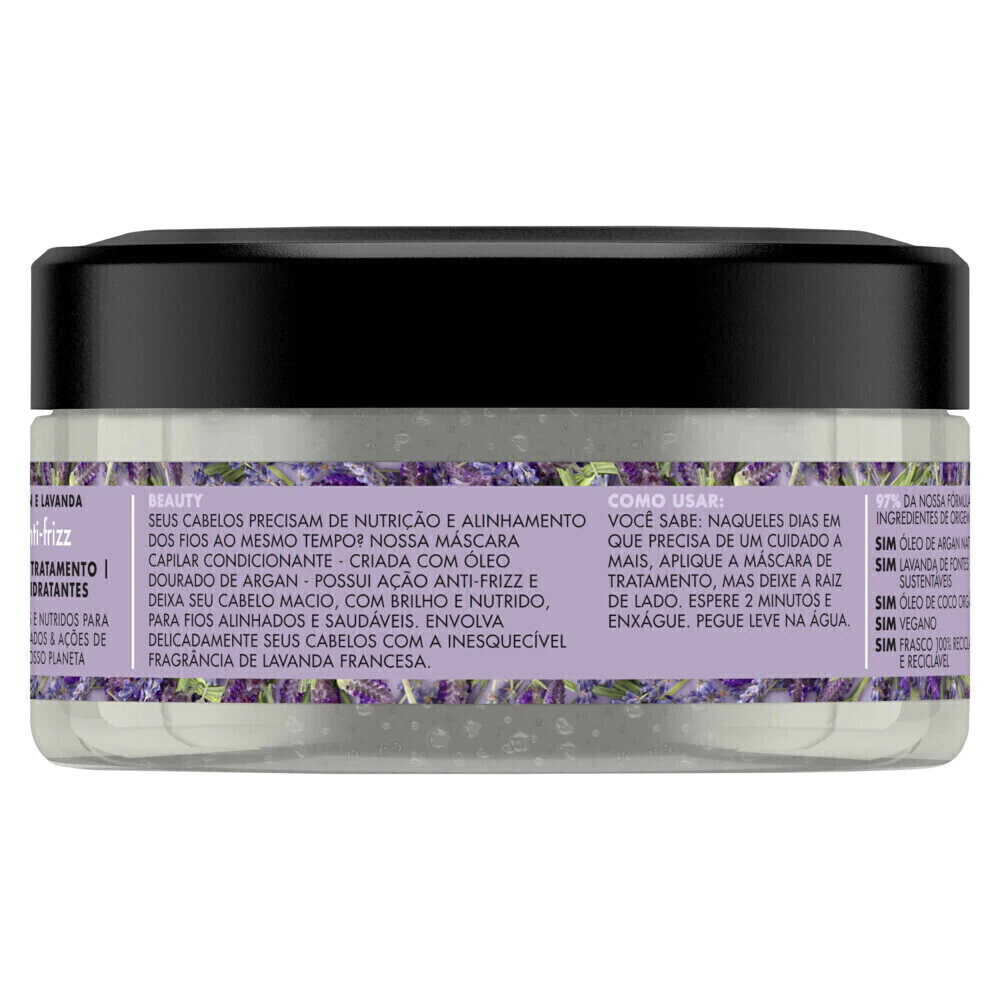 • A linha Smooth & Serene de Love Beauty and Planet, criada com óleo de argan & lavanda, possui o tratamento que você precisa para um cabelo nutrido e sem frizz. • Envolva-se com todo o delicado perfume da lavanda, cultivada de forma consciente e sustentável nos campos franceses. • Essa incrível máscara hidratante de tratamento com o luxuoso óleo de argan marroquino nutre e traz controle e maciez ao seu cabelo. • A fórmula de Smooth & Serene é vegana e não testada em animais. Além disso, é livre de Parabenos, Silicones e Corantes. • Nossos frascos não são tão transparentes, pois são feitos de plástico 100% reciclado. Eles também são recicláveis, assim causamos menos impacto no meio ambiente. • Nós acreditamos que você não precisa abrir mão de ficar bonita para cuidar do planeta. Por isso, Love Beauty & Planet incentiva suas consumidoras a fazerem pequena ações de amor pelo planeta!