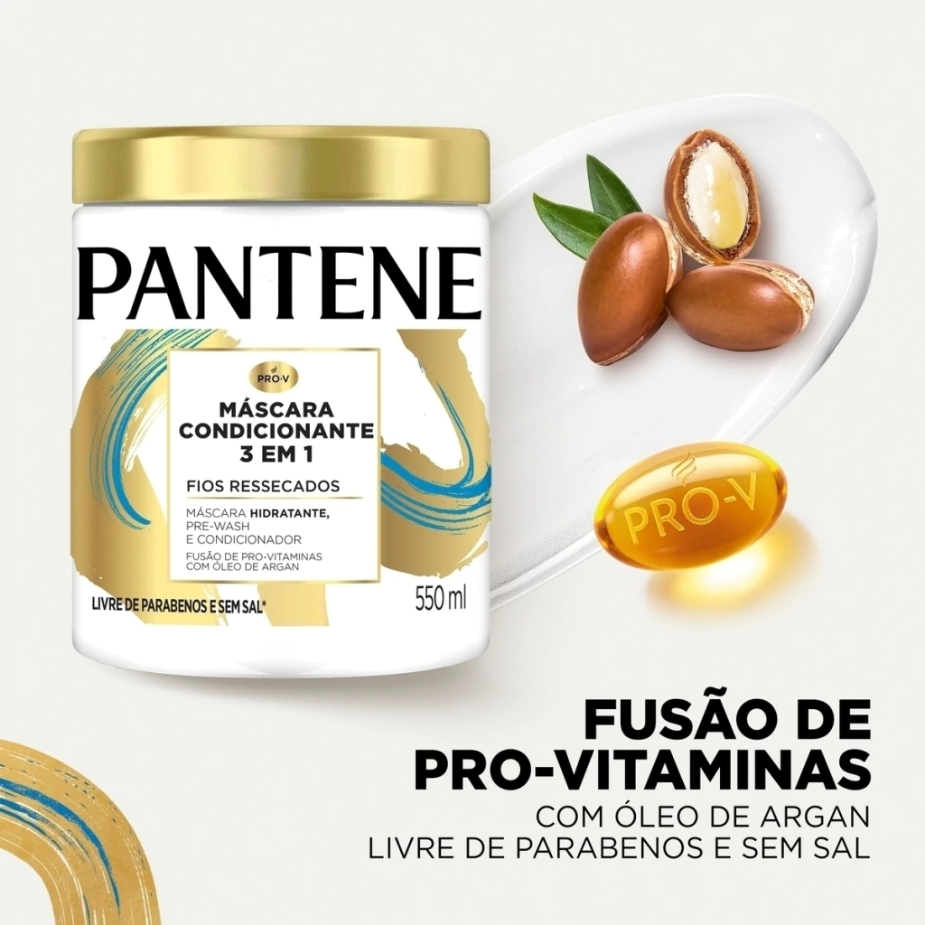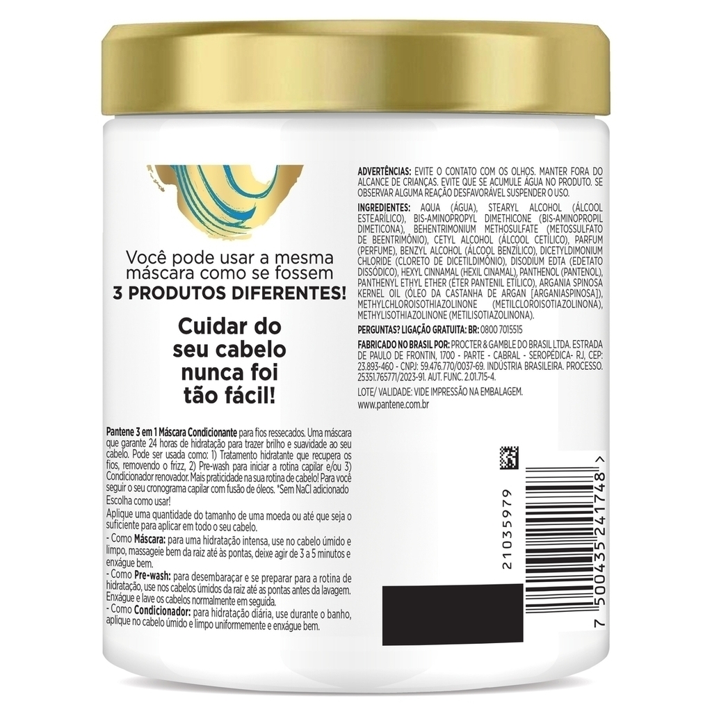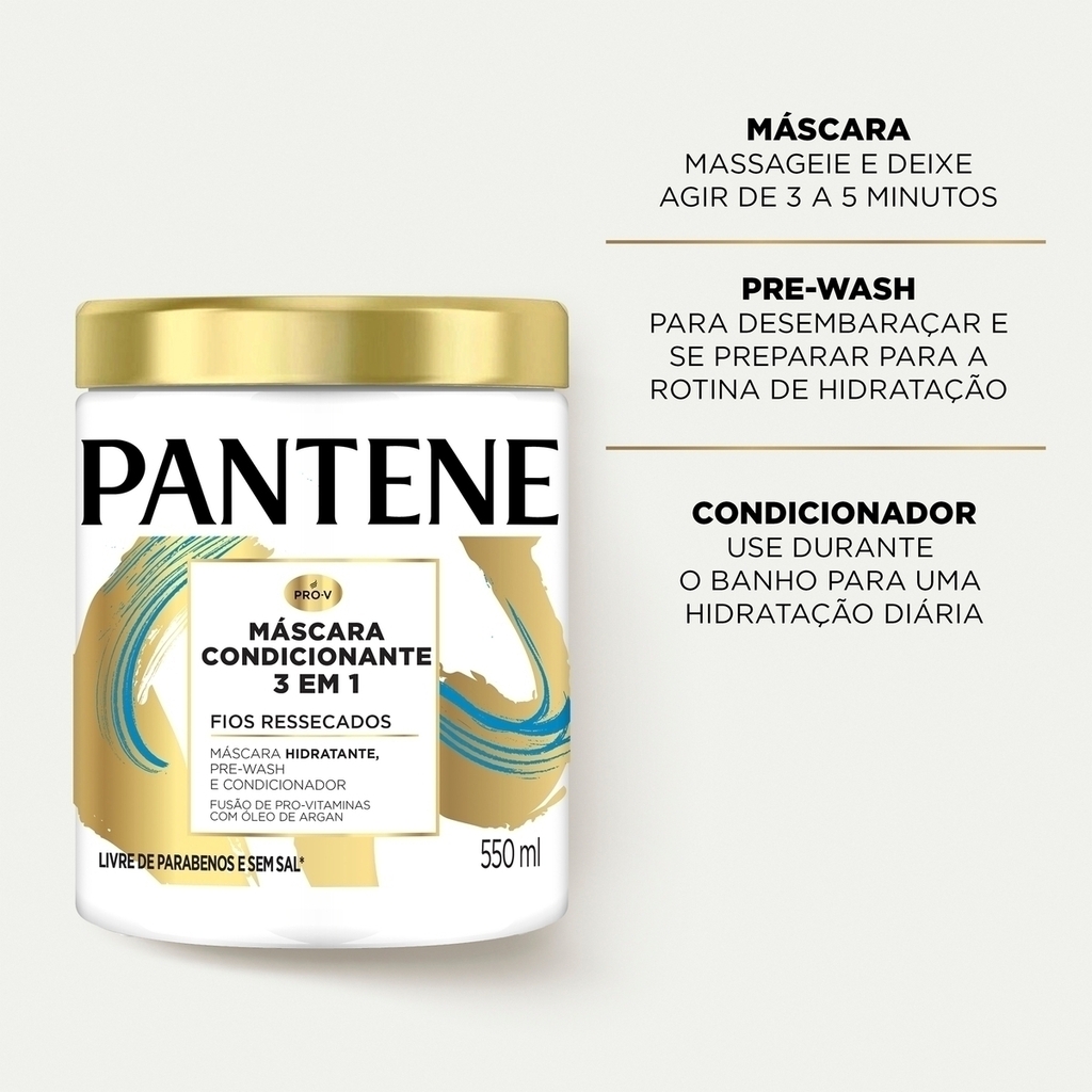 o Tratamento hidratante que recupera os fios, removendo o frizz o Pre-wash para iniciar a rotina capilar o Condicionador renovador o Pantene 3 em 1, mais praticidade e facilidade na sua rotina o Você pode usar a mesma máscara como se fossem 3 PRODUTOS DIFERENTES! Cuidar do seu cabelo nunca foi tão fácil! o Para você seguir o seu cronograma capilar, com fusão de óleos
