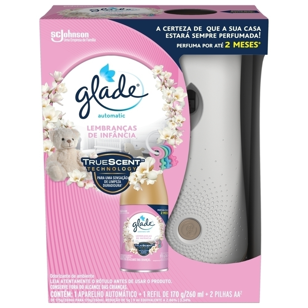 Odorizador de Glade Automatic Spray Aparelho + Refil Lembrança de Infância 260ml Um momento em família fica ainda melhor com Glade Automatic Spray, que te ajuda a criar um ambiente acolhedor. O aparelho de pilha libera automaticamente um spray discreto de fragrâncias infundidas com óleos essenciais. Não é necessário ligá-lo na tomada, basta colocá-lo no cômodo desejado e aproveitar o conforto e perfume proporcionado. Compre Produtos Glade
