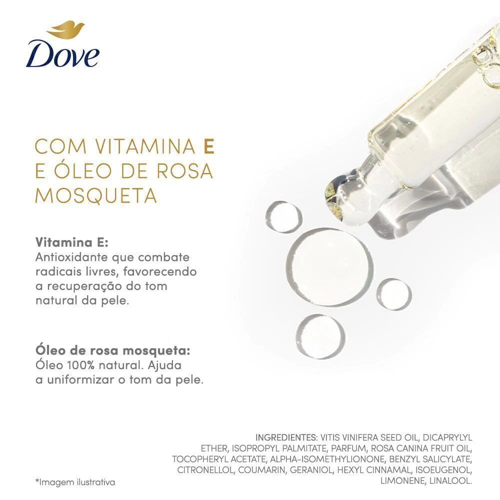 "• Sobre a fragrância: óleo Sérum Corporal Dove Tom Uniforme conta com notas de violeta trazem profundidade e notas de laranja, luminosidade. Um floral envolvente que perfuma, conforta e revela sofisticação. • Sobre o sensorial: óleo corporal com experiência sensorial única de rápida absorção e textura leve sem deixar a pele pegajosa. • Sobre o benefício: pele luminosa + redução de marcas escurecidas. • Sobre a reparação na pele: ajuda a reduzir a aparência de marcas escurecidas, promovendo um tom de pele mais uniforme e natural, através da fórmula com Vitamina E e Óleo de Rosa Mosqueta, reconhecidos por suas propriedades antioxidantes e regeneradoras. • Sobre a hidratação: hidratação intensa por 24 horas, com ação contínua na recuperação da pele. Fortalece a barreira cutânea melhorando a sua textura e aparência. • Fórmula clinicamente e dermatologicamente testada.