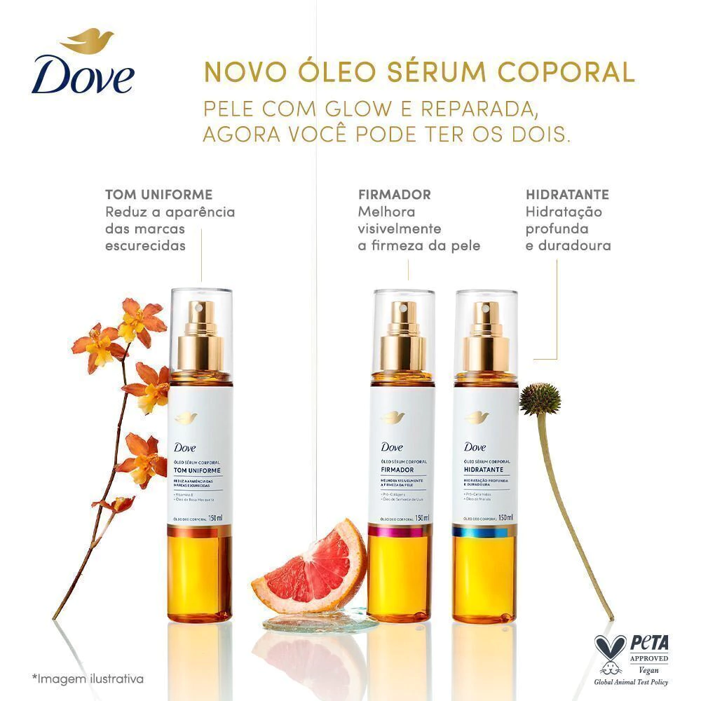 Experimente o poder do Dove Óleo Sérum Corporal Tom Uniforme, sua nova rotina para uma pele hidratada e com tom mais uniforme. O Dove óleo sérum corporal Tom Uniforme oferece tecnologia avançada para pele hidratada por 24h, toque seco e fragrância sofisticada. Você não precisa escolher entre glow e reparação, agora sua pele pode ter os dois em um só produto. Com um aplicador em spray que oferece praticidade, aplicação rápida e uniforme, o Dove Óleo Tom Uniforme proporciona uma experiência sensorial sofisticada, ideal para o cuidado diário. O uso contínuo ajuda a uniformizar o tom da pele reduzindo marcas escurecidas, a suavizar texturas e a melhorar a luminosidade, promovendo uma aparência mais saudável e revitalizada. Inclua o Dove óleo sérum corporal em sua rotina para sentir a pele hidratada, macia e uniforme todos os dias. Descubra o potencial do óleo sérum Tom Uniforme Dove e transforme o cuidado com seu corpo em um momento de bem-estar e beleza natural. Clinicamente e dermatologicamente testada. 100% das usuárias perceberam sua pele visivelmente mais radiante e uniforme.* 100% concordam que o produto melhorou visivelmente a aparência da pele.* 9 em cada 10 perceberam a pele mais jovem após 7 dias.* *Teste de percepção. Altura (com tampa): 197 mm. Capacidade: 150 ml."