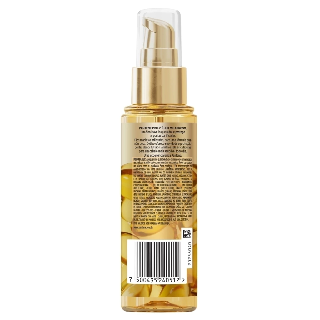 .*Em comparação ao condicionador da linha Pantene Queratina **Dano ao brilho e à suavidade. o Pantene Óleo Milagroso, fios macios e brilhantes. Fórmula que não pesa o Brilho imbatível o 3X CONCENTRAÇÃO DE PRO-VITAMINA B5* *Em comparação ao condicionador da linha Pantene Queratina o NUTRIÇÃO, BRILHO E PROTEÇÃO. ÓLEO FINALIZADOR LEAVE-IN o Uma experiência única Pantene o Alinha e sela as cutículas para um cabelo mais saudável todo dia o O óleo oferece suavidade e proteção contra danos*. *Dano ao brilho e à suavidade Aplique uma quantidade do tamanho de uma moeda nas mãos e espalhe pelo comprimento e nas pontas, pode ser usado no cabelo seco ou molhado, sem enxágue Evite o contato com os olhos, manter fora do alcance de crianças, inflamável, use somente conforme indicado, manter longe do fogo, cigarros acesos e de temperaturas extremas, usar somente em áreas ventiladas, se observar alguma reação desfavorável suspender o uso