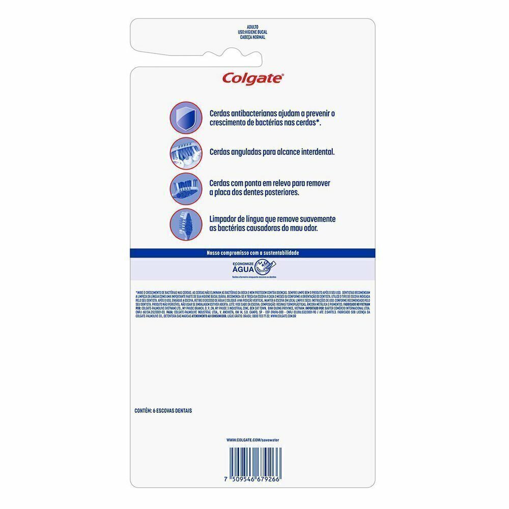 Cerdas antibacterianas* que ajudam a previnir o crescimento de bactérias nas cerdas (*as cerdas não eliminam as bactérias da boca e nem protegem contra doenças. Sempre limpe bem o produto após o seu uso).