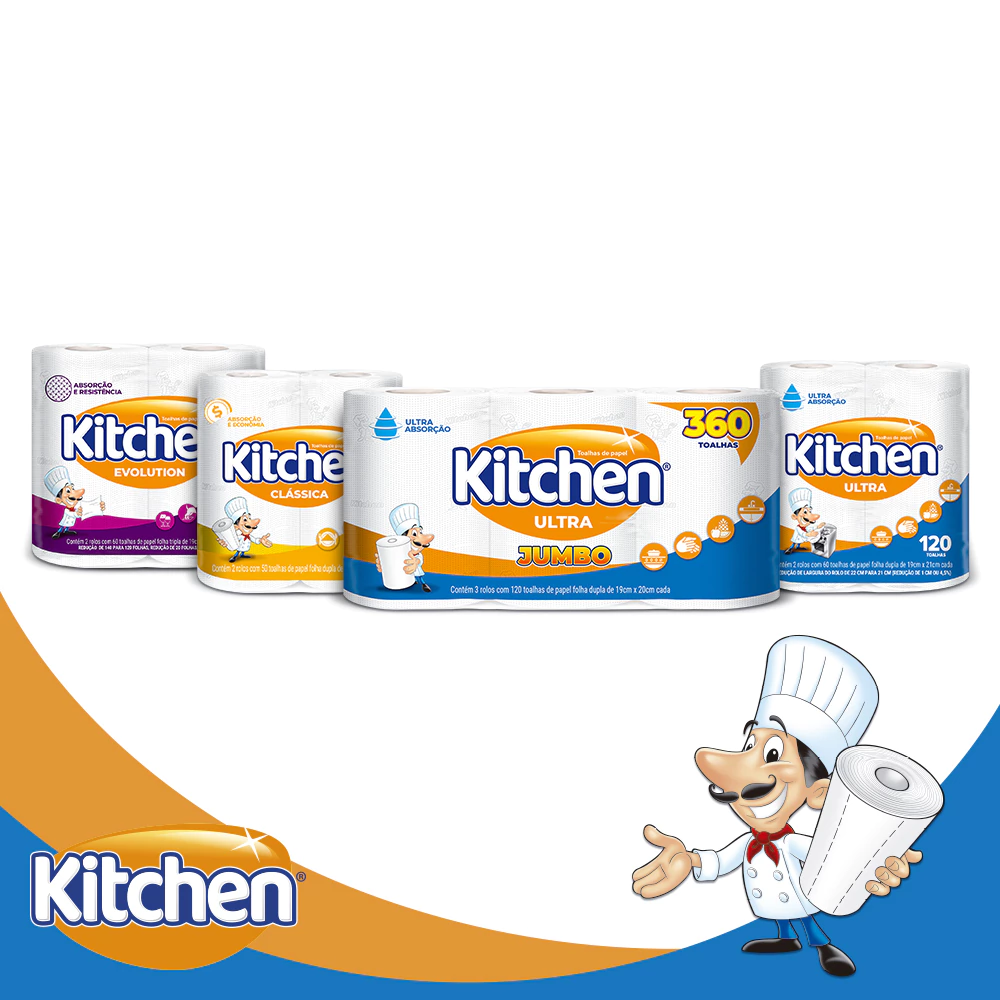 As toalhas de papel Kitchen são a perfeita escolha de quem deseja máxima absorção, resistência e praticidade para o dia a dia. Kitchen serve para tudo nas mais variadas ocasiões, desde a absorção em alimentos até a secagem de louças e superfícies, o embrulho de lanches e frutas e auxílio na limpeza leve. Disponível nas versões folha dupla com 120 folhas, 240 e 540 folhas.