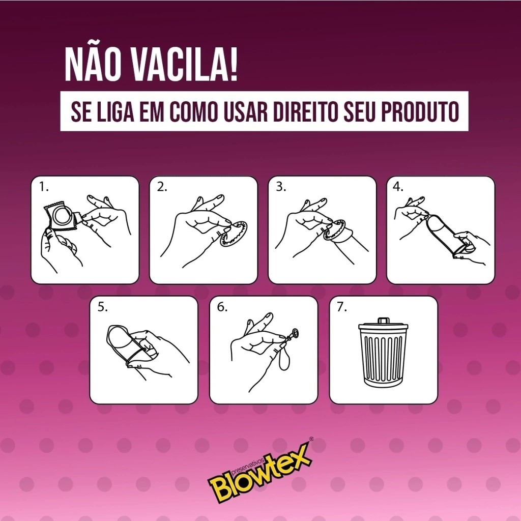 Blowtex é uma tradicional marca de preservativos presente no mercado brasileiro há mais de 25 anos e com produtos para todos os gostos.Produzidos com qualidade para atender todos os requisitos estabelecidos pela normatização técnica vigente, os produtos Blowtex são 100% lubrificados e testados eletronicamente, além de oferecer uma variedade de opções que promovem uma relação íntima muito mais divertida e prazerosa.Além do tradicional Blowtex Lubrificado, a marca conta também com opções saborizadas (Blowtex Morango, Blowtex Morango com Chocolate, Blowtex Menta, Blowtex Uva Verde, Blowtex Tutti Frutti, Blowtex Mix de Sabores e Blowtex Twist), com efeito retardante ou texturizadas (Blowtex Prazer Prolongado, Blowtex Action e Blowtex Orgazmax+), versões extra finas (Blowtex Zero e Blowtex Sensitive Super Aloe Vera) ou com benefício diferenciado (Blowtex Hot e Blowtex Extra Grande).