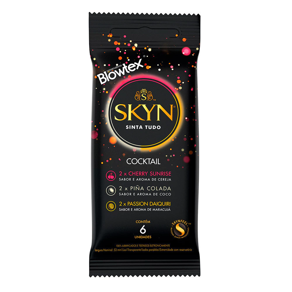 SKYN® Cocktail é um pack de preservativos sortidos inspirados nos sabores dos coquetéis mais famosos do mundo: no pacote, você encontra 2 unidades de Cherry Sunrise (sabor e aroma de cereja), 2 unidades de Piña Colada (sabor e aroma de coco) e 2 unidades de Passion Daiquiri (sabor e aroma de maracujá).