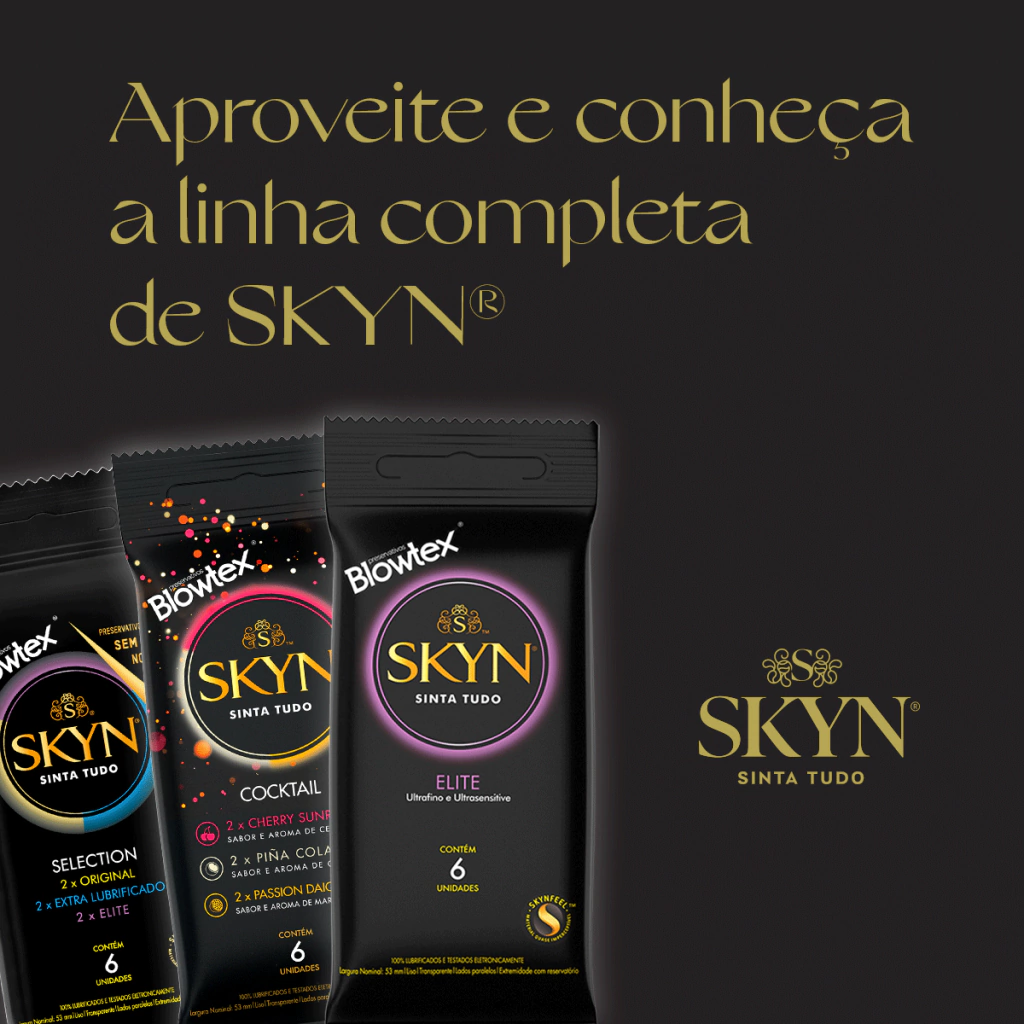 SKYN® é especialista em intimidade e acredita que a jornada para o prazer é infinita. Por esse motivo, SKYN® oferece uma linha completa de preservativos para todos os gostos: além das tradicionais SKYN Original e SKYN Elite, a marca conta com opções saborizadas SKYN Sexy Cherry (sabor Cereja) e SKYN Cocktail (inspirada nos coquetéis mais famosos do mundo: Passion Daiquiri, Cherry Sunrise e Piña Colada), e com benefícios diferenciados, como SKYN Texturizado, SKYN Extra Lubrificado (com lubrificação extra), SKYN Extra Grande (mais larga, para maior conforto) e SKYN Selection (pack sortido com os melhores SKYN®).