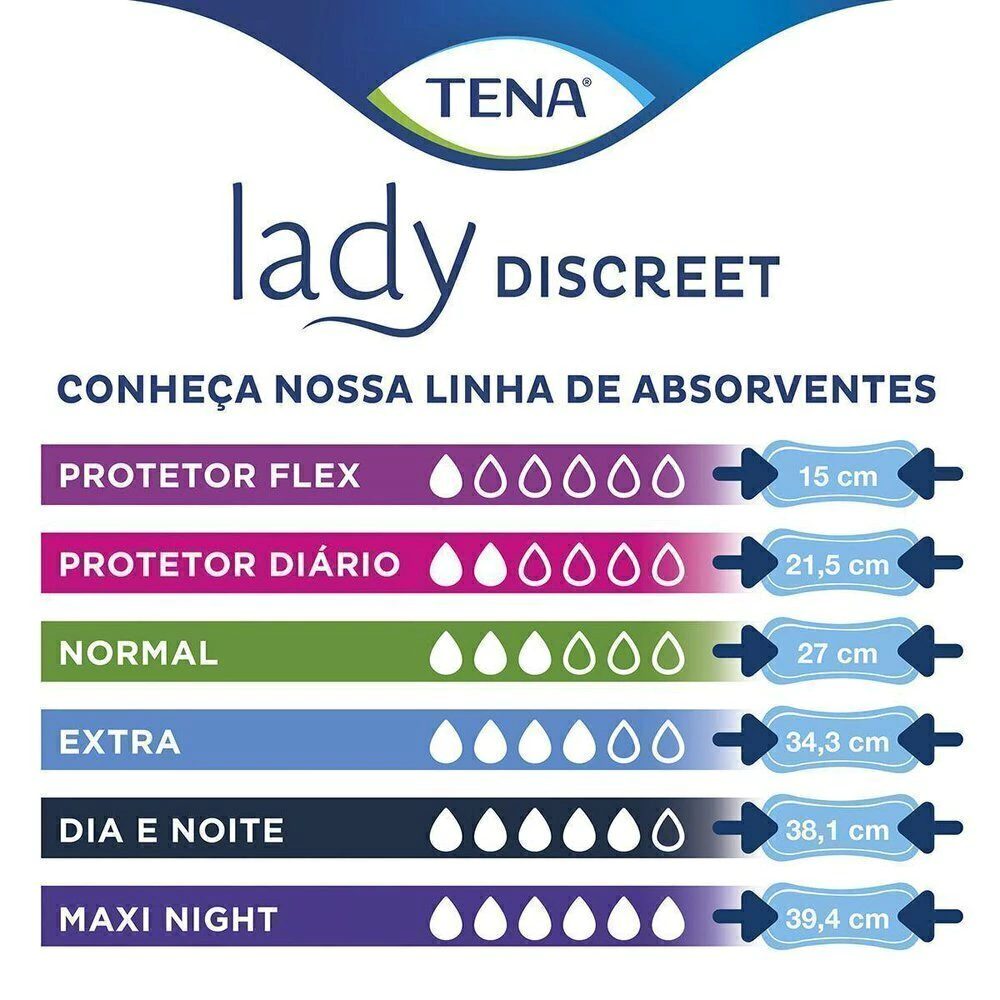 "Protetor Diário TENA Lady Discreet Flex é um protetor de calcinha, específico para mulheres?com incontinência urinária leve. É ideal para gotejamentos e pequenos escapes de urina (espirros, risadas, ou algum escape com exercícios físicos). Indicado para usuárias ativas com mobilidade.?Desenvolvido especialmente para se adaptar aos diversos tipos de calcinha, oferecendo segurança e conforto. Um protetor diário?com design anatômico, mais largo na frente e menor e mais?flexível na parte de trás. Garante total conforto num produto fino e flexível, se adaptando à todos os modelos de calcinha. Você pode escolher a roupa ideal em qualquer ocasião sem se preocupar! Seu material é de alta absorção, macio, suave e possui controle de odor.