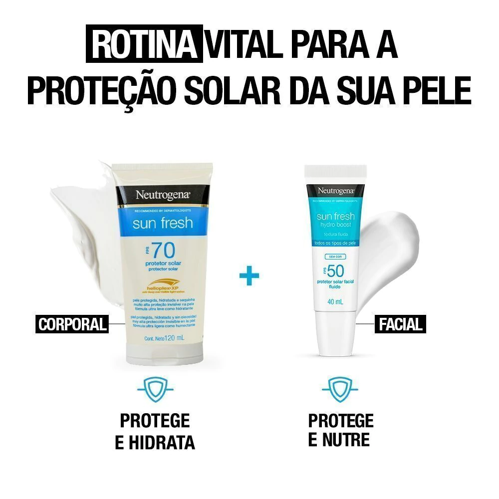 O Protetor Solar Corporal NEUTROGENA SUN FRESH® FPS 70, 120mL de textura ultraleve, antioxidante, que deixa a pele hidratada, fresca e sequinha. É de rápida absorção, fácil de aplicar e possui tecnologia HELIOPLEX® que proporciona alta proteção contra os raios UVA e UVB, além de prevenir o envelhecimento e as manchas causadas pelo sol e ser muito resistente à água e ao suor