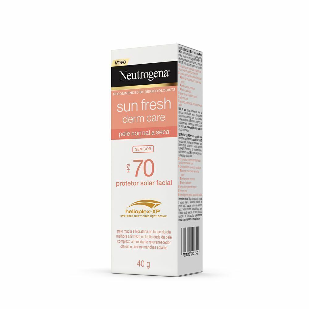 Protetor Solar Facial Para Pele Seca NEUTROGENA SUN FRESH® Derm Care Sem Cor FPS 70, 40g possui textura ultraleve e hidratante que não derrete e oferece alta proteção contra os raios UVA, UVB e ajuda a proteger contra a luz visível com sua exclusiva tecnologia HELIOPLEX® XP. Com ativos ricos em propriedades hidratantes que deixam a pele macia, aveludada e preenchida e complexo antioxidante rejuvenescedor formado por Niacinamida, ativo clareador de sinais causados pelo sol, Feverfew e Vitamina C, poderosos antioxidantes. Melhora a firmeza e elasticidade da pele e possui textura não oleosa. Dermatologicamente testado e adequado para peles sensíveis.