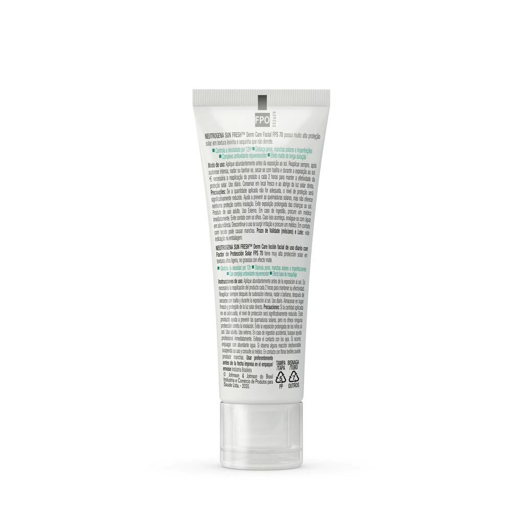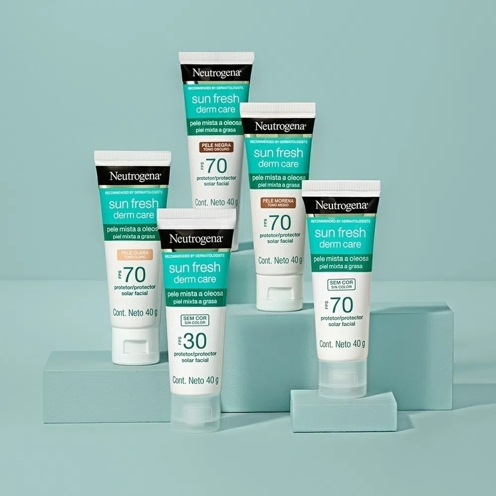 Protetor Solar Facial Para Pele Oleosa NEUTROGENA SUN FRESH® Derm Care Pele Morena FPS 70, 40g, controla a oleosidade por 12h, com complexo antioxidante rejuvenescedor e efeito matte de longa duração. Com textura ultraleve e sequinha que não derrete. A exclusiva tecnologia HELIOPLEX®XP oferece alta proteção ampla e eficaz contra os raios UVB, UVA e ajuda contra a luz visível.