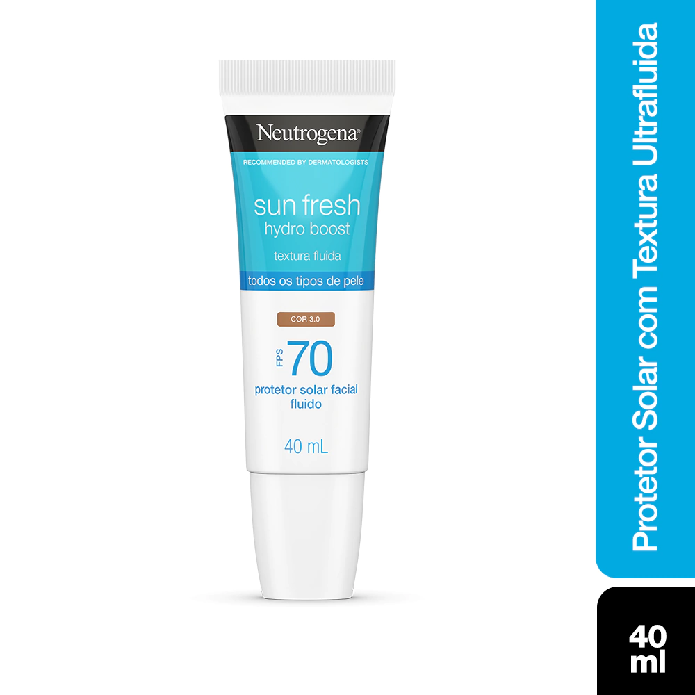 NEUTROGENA SUN FRESH® Hydro Boost FPS 50 SEM COR: Possui textura fluida para todos os tipos de pele. A exclusiva tecnologia HELIOPLEX(TM) SL oferece muito alta proteção, forma uma barreira protetora contra raios UV, ajuda a proteger contra a luz visível e poluição,protegendo a vitalidade da pele e reverte danos solares, entregando um boost de nutrição e vitaminas. Com Ácido Hialurônico, que hidrata profundamento por 12 horas*. Niacinamida: ativo clareador de sinais causados pelo sol; Vitamina C e E: antioxidantes. **É NECESSÁRIA A REAPLICAÇÃO DO PRODUTO A CADA 2 HORAS PARAMANTER A EFETIVIDADE DO PROTETOR SOLAR.