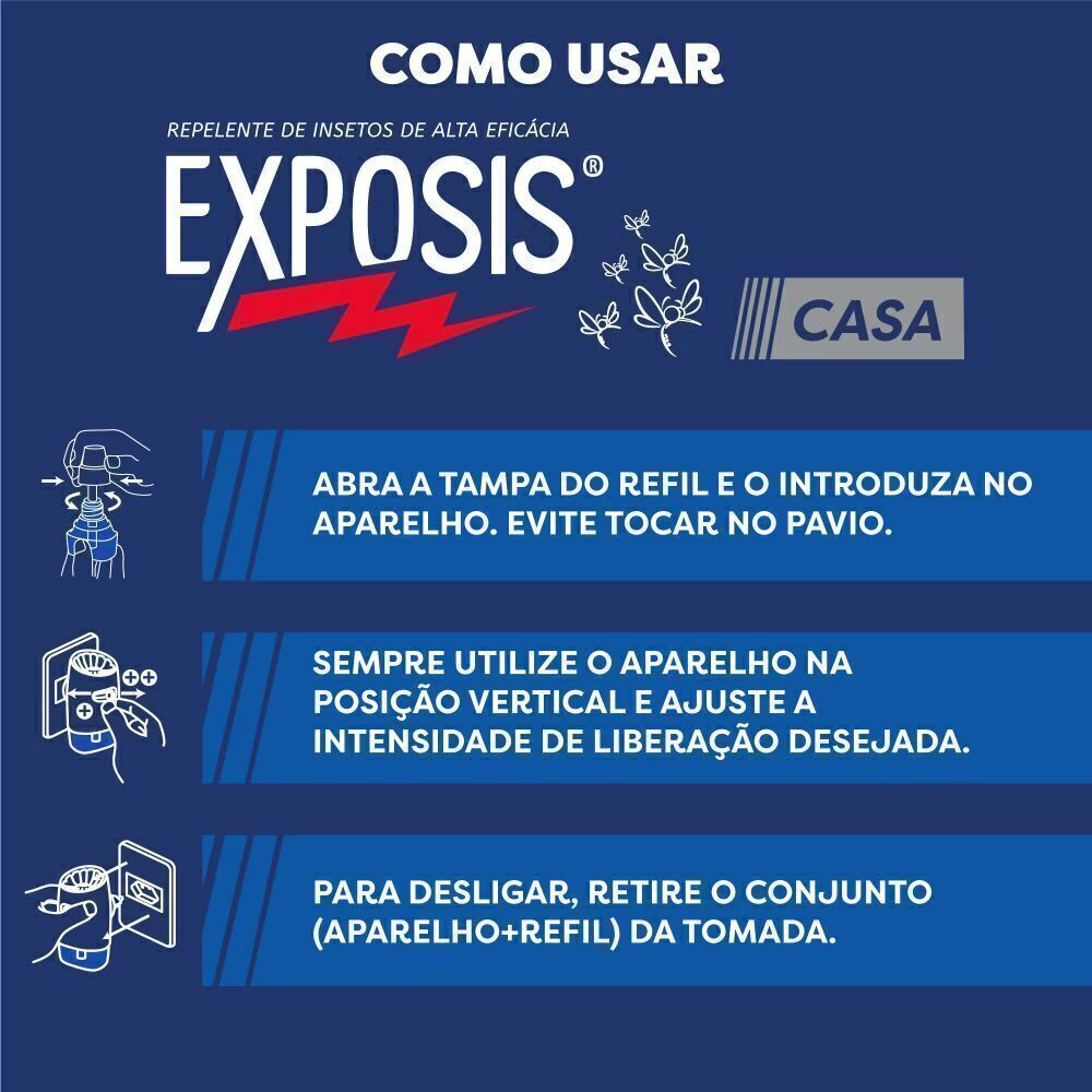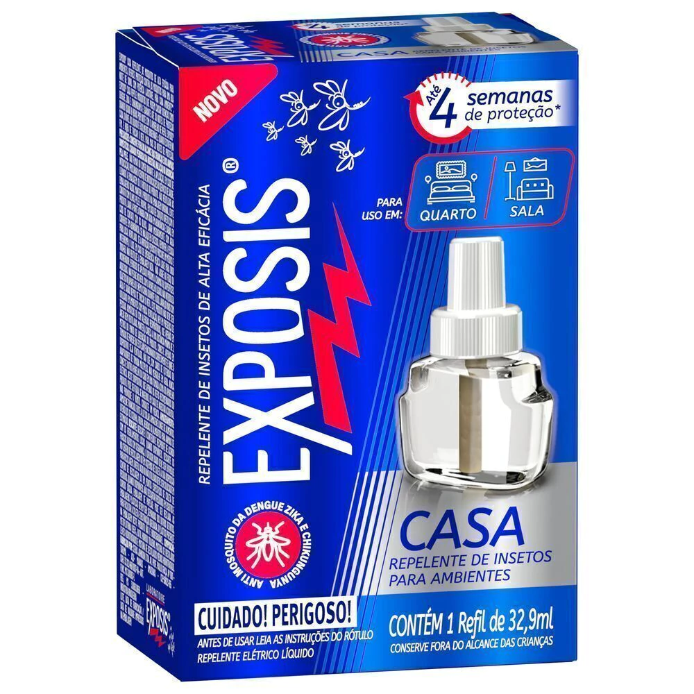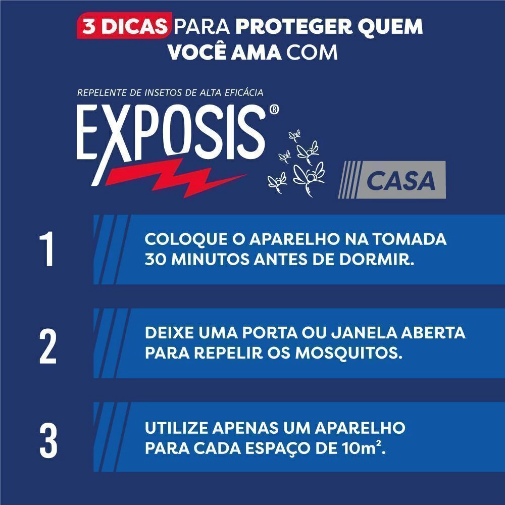 Exposis Casa é o repelente de insetos para ambientes da marca mais recomendada por médicos. Possui alta eficácia e é a solução ideal para proteger sua família contra mosquitos causadores de doença como Dengue, Zika e Chikungunya. Fornece até 4 semanas de proteção para sua casa.