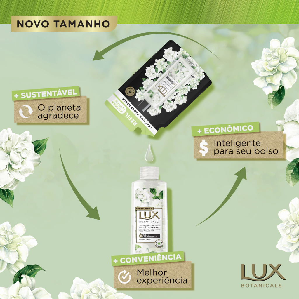 Sinta a espuma cremosa e a delicada fragrância do Sabonete Líquido Refil Lux Botanicals Buquê de Jasmim para uma pele irresistivelmente perfumada. Sua fórmula foi especialmente desenvolvida para proporcionar uma sensação de pele aveludada, tornando o banho o início de qualquer ritual de beleza e deixando a sua pele preparada para receber os próximos cuidados.