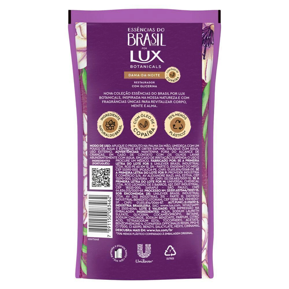 o O Sabonete Líquido Refil Lux Essências do Brasil Dama-da-noite possui uma fragrância única e revitalizante o Sua fórmula contém glicerina e óleo de copaíba, ingredientes conhecidos pelas propriedades altamente hidratantes, que deixam suas mãos macias ao toque o Perfume floral com benefícios antioxidantes, mantendo suas mãos protegidas e perfumadas o Experimente o sabonete líquido Lux Dama-da-Noite com poder restaurador e hidratante, desfrutando de mãos suaves e delicadamente perfumadas o A opção refil possui 70% menos plástico* contribuindo para um planeta mais sustentável o Fragrância única para revitalizar corpo, mente e alma