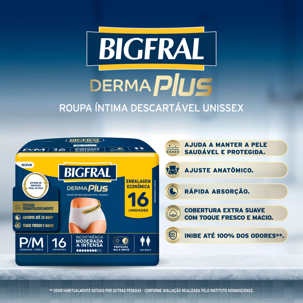 A nova roupa íntima Bigfral Derma Plus possui sistema de proteção total da pele, é dermatologicamente testada, absorve até 2x mais para que a pele não fique úmida deixando-a mais seca e protegida e possui toque fresco e macio. Indicada para homens e mulheres com incontinência urinária moderada a intensa. Veste como sua roupa íntima habitual e garante todo conforto e segurança para manter sua rotina.