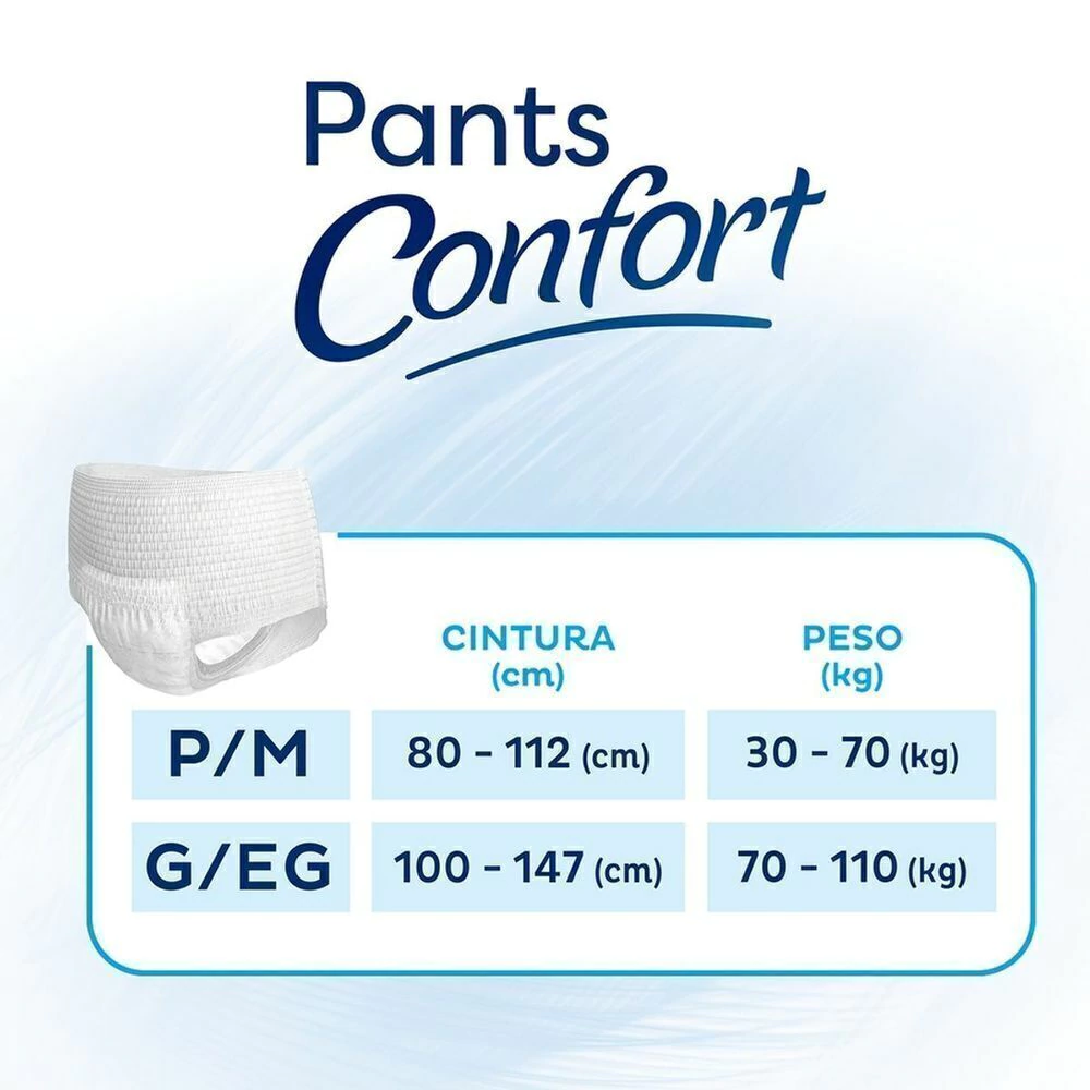 "TENA Pants Confort é uma roupa íntima descartável e unissex de rápida absorção, proporcionando ao usuário ativo facilidade de uso, discrição e segurança. É indicado para perdas de urina moderada a severa. A excepcional segurança deve-se à tecnologia High Soft, que absorve rapidamente mesmo grandes quantidades de urina mantendo-a longe da pele de forma que, mesmo sentado ou deitado durante muito tempo, o usuário permanece seco e confortável, reduzindo significativamente o risco de irritações ou infecções cutâneas.