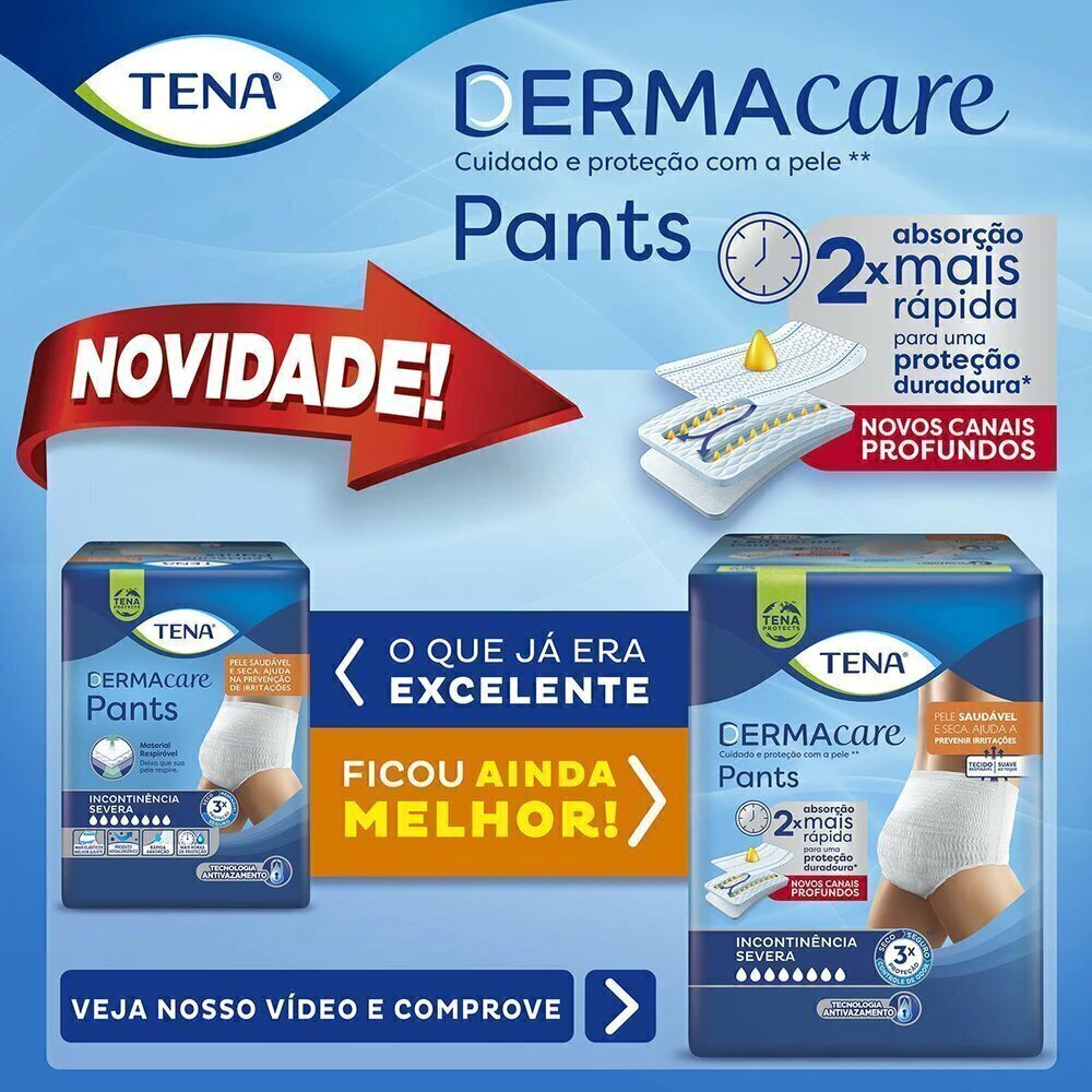 "TENA Pants Dermacare é uma roupa íntima descartável e unissex de rápida absorção, que proporciona ao usuário ativo facilidade e praticidade de uso, discrição e segurança. Produto com elásticos em volta da cintura que garante um ajuste perfeito ao corpo. Além da proteção da pele que ajuda na prevenção de irritações, permitindo que a mesma esteja sempre saudável e seca. É indicado para perdas de urina severa. A excepcional segurança deve-se à tecnologia antivazamento que absorve rapidamente mesmo grandes quantidades de urina mantendo-a longe da pele de forma que, mesmo sentado ou deitado durante muito tempo, o usuário permanece seco e confortável, reduzindo significativamente o risco de infecções cutâneas. Um produto hipoalergênico com tecido respirável e macio. Proteção e cuidado para a pele todos os dias. o Tecnologia antivazamento - segurança máxima contra vazamentos; o Proteção da pele; o Núcleo de Rápida Absorção; o Controle de Odores - neutraliza o risco de odores indesejáveis; o Material macio, suave e respirável; Elásticos em volta da cintura permitindo um ajuste perfeito ao corpo; o Elásticos duplos nas pernas para um melhor conforto e segurança contra vazamentos; o Costuras laterais removíveis para retirar o produto com maior facilidade."
