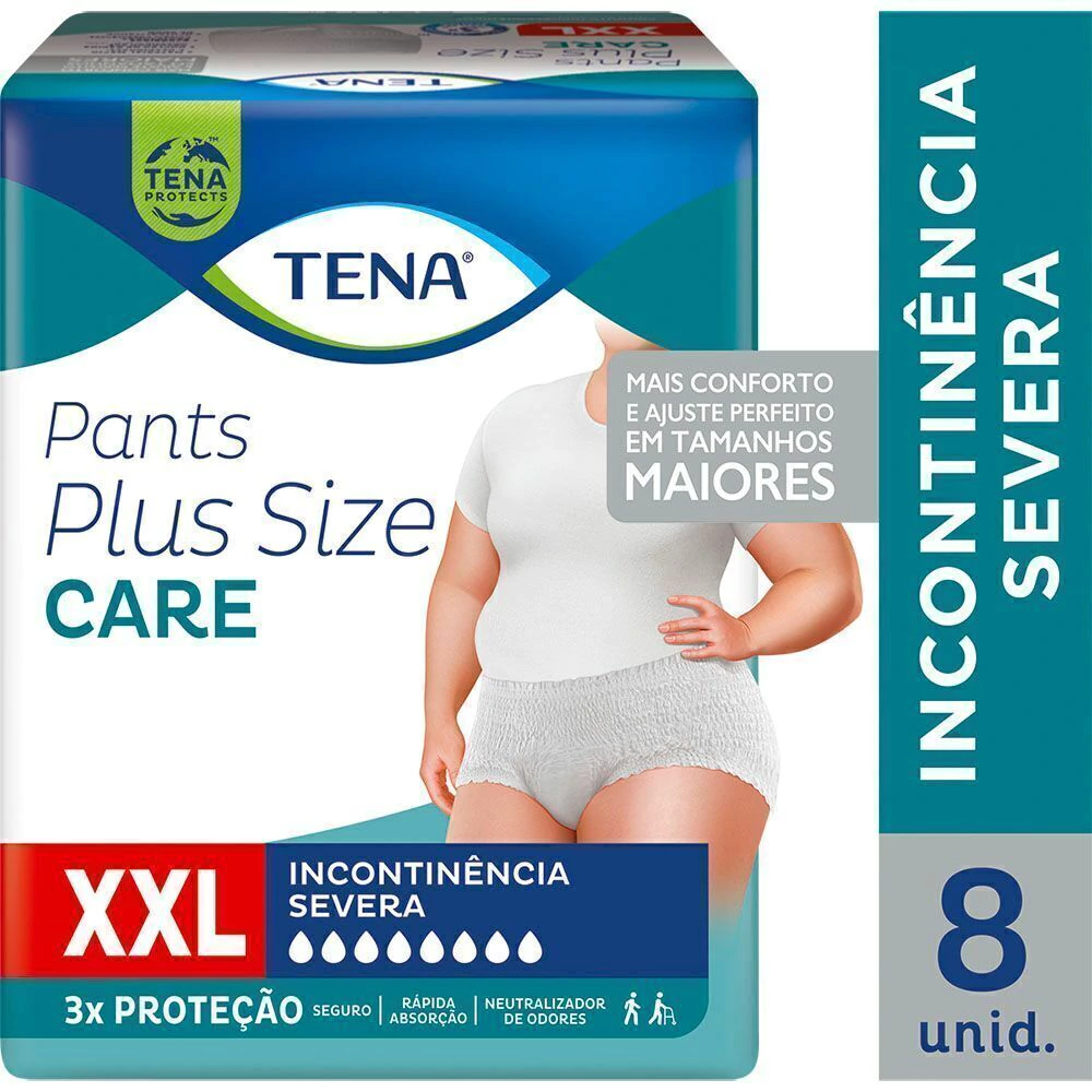 o Indicado para incontinência severa, com material macio e respirável; o Para usuários com mobilidade, mais conforto e ajuste perfeito em tamanhos maiores; o Rápida absorção, que proporciona ao usuário ativo segurança e proteção da pele; o Elásticos duplos nas pernas para um melhor conforto e segurança contra vazamentos; o Controle de odor: Tena Plus Size é projetada para minimizar o odor desagradável, mantendo uma sensação de frescor e higiene; o No tamanho XXL (120-160cm) para pessoas com mais de 100kg. Pode ser usada também para pós-parto.