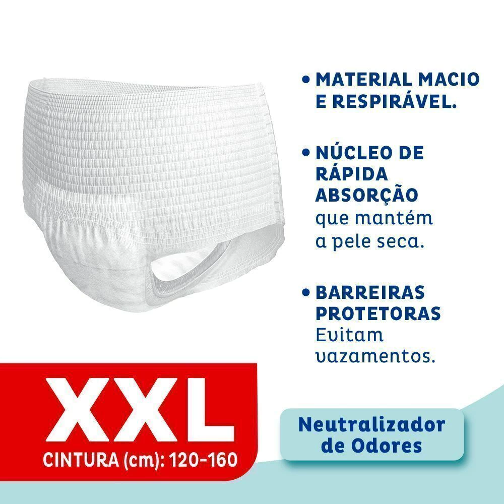 A Roupa Íntima Tena Pants Plus Size Care é descartável e unissex de rápida absorção, que proporciona ao usuário ativo facilidade e praticidade de uso, discrição e segurança. Tena Pants Plus Size é projetada para oferecer um ajuste confortável e seguro para adultos com sobrepeso ou obesidade. Pants Plus Size possui elásticos em volta da cintura que garante um ajuste perfeito ao corpo, oferecendo conforto e segurança. Além da proteção da pele que ajuda na prevenção de irritações, permitindo que a mesma esteja sempre saudável e seca. É indicado para perdas de urina severa. Um produto hipoalergênico, desenvolvido para minimizar riscos de alergias, com tecido respirável e macio. Proteção e cuidado para a pele todos os dias. As roupas íntimas Tena Plus Size são projetadas para minimizar o odor desagradável, mantendo uma sensação de frescor e higiene.