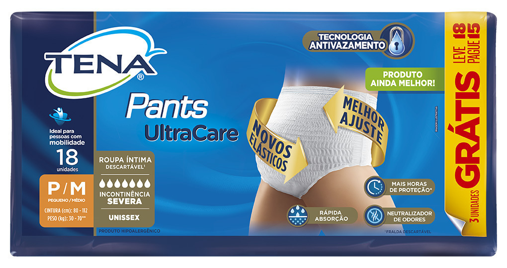 TENA Pants ULTRA é uma roupa íntima descartável e unissex de rápida absorção, proporcionando ao usuário ativo facilidade de uso, discrição e segurança. É indicado para perdas de urina severa. A excepcional segurança deve-se à tecnologia High Soft, que absorve rapidamente mesmo grandes quantidades de urina mantendo-a longe da pele de forma que, mesmo sentado ou deitado durante muito tempo, o usuário permanece seco e confortável, reduzindo significativamente o risco de irritações ou infecções cutâneas DIFERENCIAIS: Barreira anti-vazamento - segurança máxima contra vazamentos; Núcleo de Ultra Absorção; Odour Neutralizer(TM) - Sistema que neutraliza o risco de odores indesejáveis; Cobertura Interna de Não Tecido - material macio suave ao contato com a pele; Elásticos suaves em volta da cintura permitindo uma adaptação perfeita ao corpo; Elásticos duplos nas pernas para um melhor conforto e segurança contra vazamentos; Costuras laterais removíveis para retirar o produto com maior facilidade.