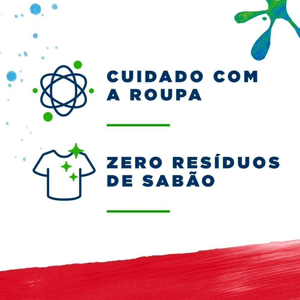 *Rendimento calculado de acordo com a recomendação de uso. Máquina de capacidade de 11 kg. **Manchas de isotônico, sorvete de morango e óleo de cozinha, em tecido algodão. ***Fórmula sem ingredientes que possam danificar os tecidos, como percarbonato de sódio e peróxido de hidrogênio. ****Xícara de chá de 240 ml. *****Em comparação com máquinas de uso doméstico.