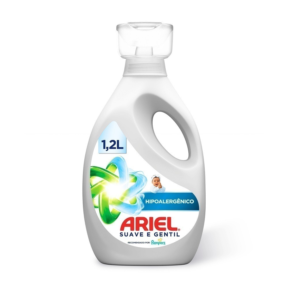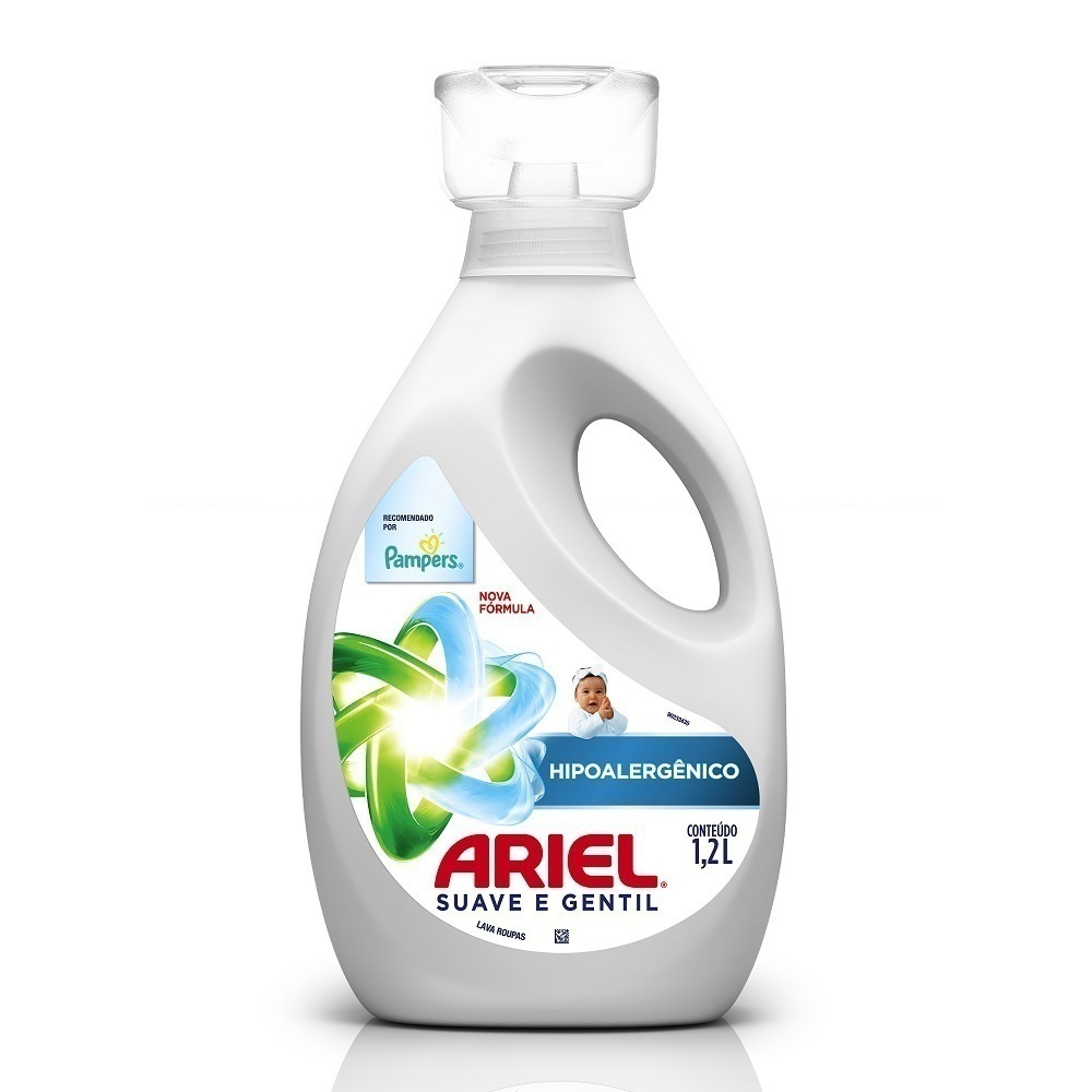 O sabão líquido Ariel Suave e Gentil é hipoalergênico, não possui corantes e é dermatologicamente testado;