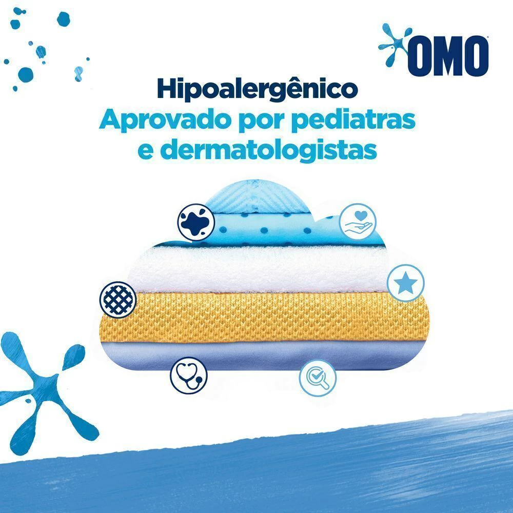 O Sabão Líquido OMO Puro Cuidado, com toque de aveia*** foi especialmente formulado para cuidar das roupas sem agredir as peles mais delicadas. A nova fórmula hipoalergênica e extra suave com pH balanceado é recomendada para peles delicadas**, perfeita para as roupinhas do bebê. Este detergente líquido OMO Puro Cuidado, sem corantes, é aprovado por pediatras e dermatologistas. Além de respeitar as peles mais delicadas, este lava roupas combate as manchas mais difíceis, imbatível até nas manchas da introdução alimentar* e cuida do meio ambiente.