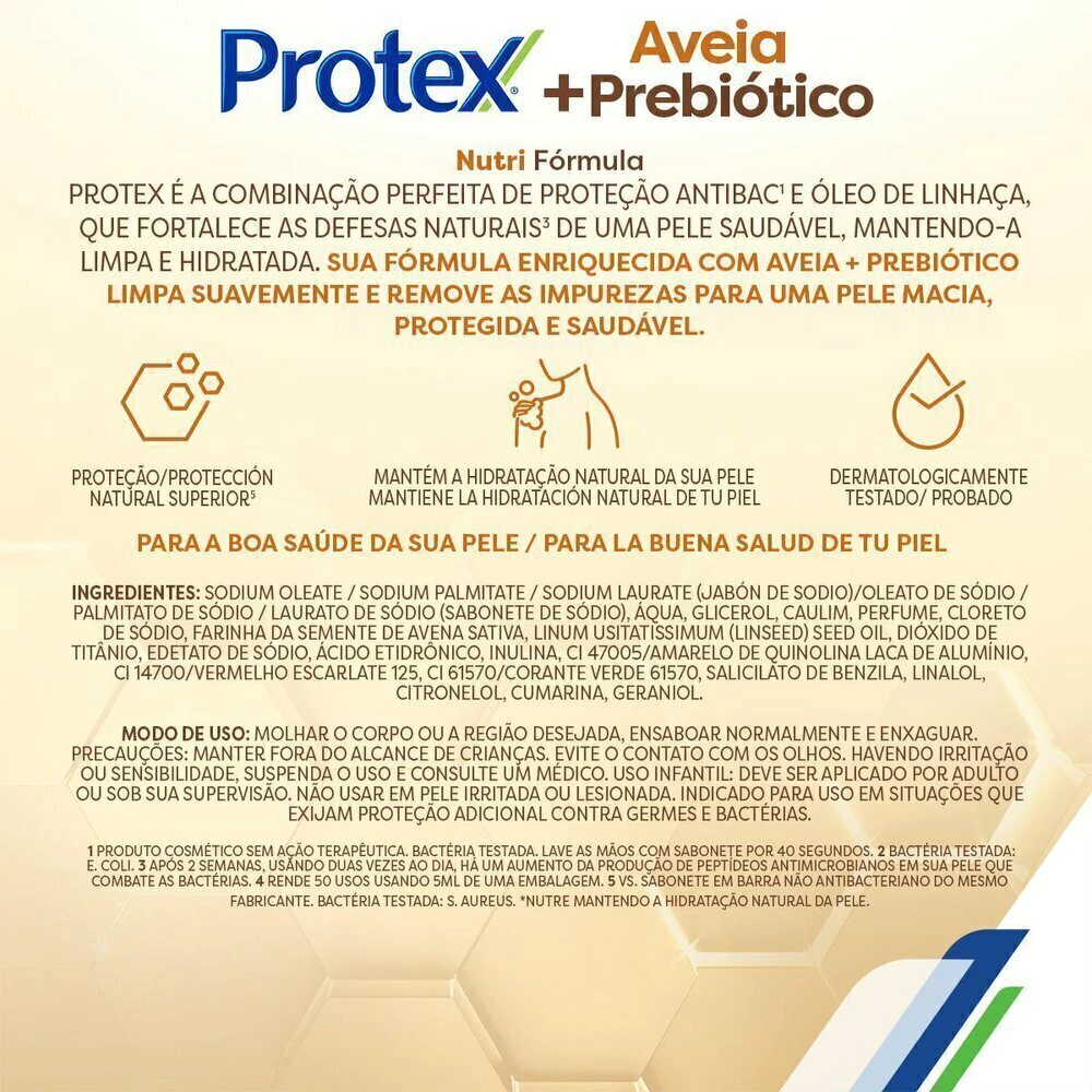 Protex® Aveia e Prebióticos cuida da pele do corpo e do rosto, ajudando a remover a oleosidade da pele, sem ressecá-la. Oferece proteção antibacteriana natural com óleo de linhaça e Elimina 99,9% das bactérias* naturalmente, mantendo você protegido por até 12h**.