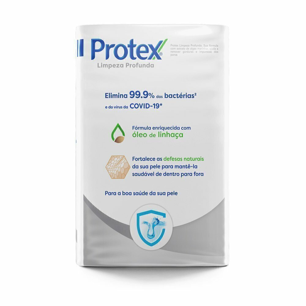 Protex® Limpeza Profunda cuida da pele do corpo e do rosto, ajudando a remover a oleosidade da pele, sem ressecá-la. Oferece proteção antibacteriana natural com óleo de linhaça e Elimina 99,9% das bactérias* naturalmente, mantendo você protegido por até 12h**.