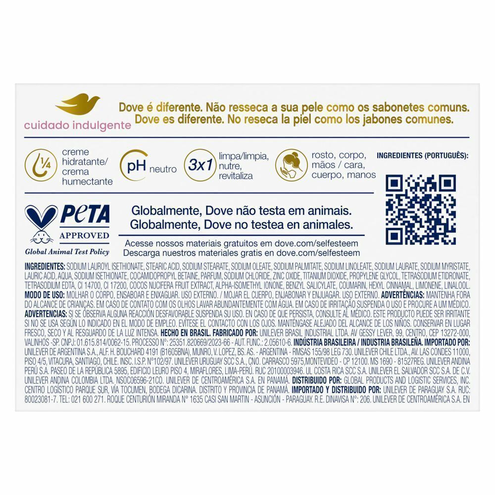 Dove não é um sabonete comum, é uma barra de beleza que vai além da limpeza, nutrindo a pele enquanto remove a sujeira do dia a dia. O Sabonete em Barra Dove Cuidado Indulgente faz uma espuma cremosa e deixa a sua pele com uma sensação renovada. Acreditamos que o segredo para uma pele bonita é a hidratação diária, e nenhum sabonete comum hidrata melhor do que Dove. Este sabonete em barra combina uma fórmula de limpeza suave com 1/4 de creme hidratante e um delicioso perfume de leite de coco com jasmim em sua fórmula, que ajuda a acalmar e nutrir a sua pele e te deixa em um estado de paz e tranquilidade. Dove Cuidado Indulgente tem pH neutro, não interferindo no próprio pH da pele e ajudando a manter a barreira de proteção natural saudável. Para uma melhor experiência no banho, sugerimos o seguinte modo de uso: primeiro, molhe as mãos e passe o Sabonete Dove Cuidado Indulgente entre elas, até formar uma espuma cremosa. Em seguida, massageie a espuma pelo seu corpo e, por último, enxágue com água morna. O Sabonete Dove Cuidado Indulgente não vai deixar a sua pele seca e áspera como os sabonetes comuns fazem, e você pode usá-lo diariamente no corpo, mãos e no rosto para uma pele limpa, nutrida e revitalizada. O Sabonete Dove Cuidado Indulgente é dermatologicamente recomendado. Dove é certificada Cruelty-Free pela PETA, sendo assim, não realizamos e nem realizaremos testes em animais em nenhum lugar do mundo.