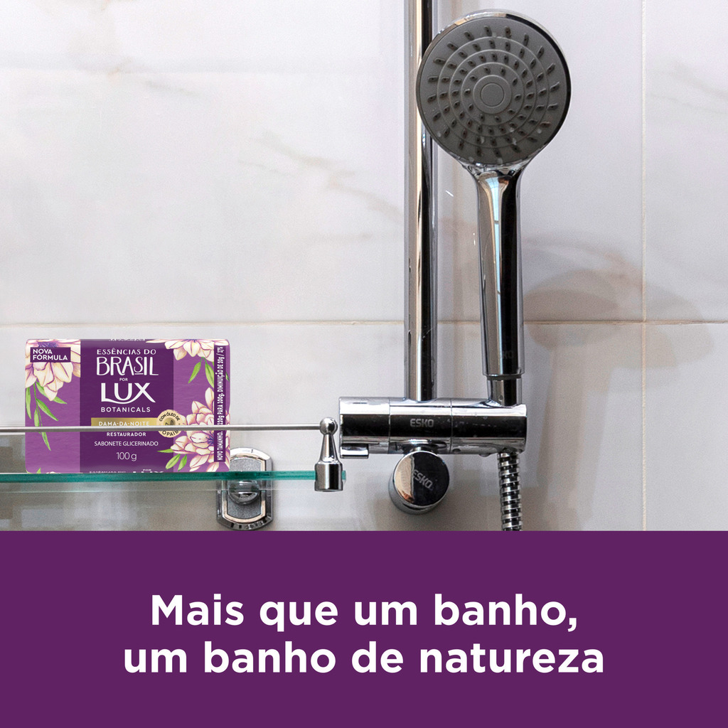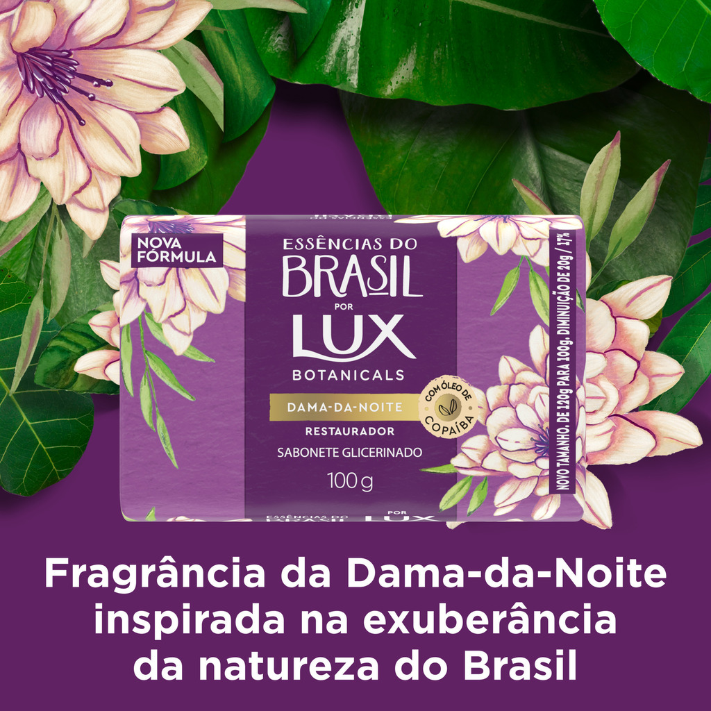 Conheça o Sabonete em Barra Essências do Brasil por Lux Botanicals Dama da Noite 100g, com poder revitalizador e formulado com ingredientes naturais, transformando seus banhos em puros momentos de prazer. Cada fragrância foi especialmente criada para revitalizar o seu corpo, mente e alma. A coleção, inspirada na exuberância da natureza do Brasil, foi baseada nos nossos rituais e tradições para transformar o seu momento de autocuidado em uma rotina de beleza diária. A fragrância Dama da Noite, típica da Mata Atlântica, possui um acorde frutado fresco e fluido com notas cítricas. A fórmula do Sabonete em Barra Essências do Brasil por Lux Botanicals Dama da Noite contém óleo de copaíba, ingrediente com propriedades altamente hidratantes, além de conter glicerina para evitar o ressecamento da sua pele. Além disso, a marca possui outras opções de fragrâncias na linha: Flor do Cajueiro, Dama-da-Noite e Vitória-Régia. A coleção oferece formatos inéditos que trazem sensações e texturas únicas, assim uma nova garrafa transparente, moderna e sustentável, feita 100% de plástico reciclado e reciclável e com a opção de refil, com 70% menos plástico*, para manter o planeta saudável. Transforme a sua experiência de banho em um momento único e prazeroso com os benefícios dos sabonetes Essências do Brasil por Lux Botanicals.