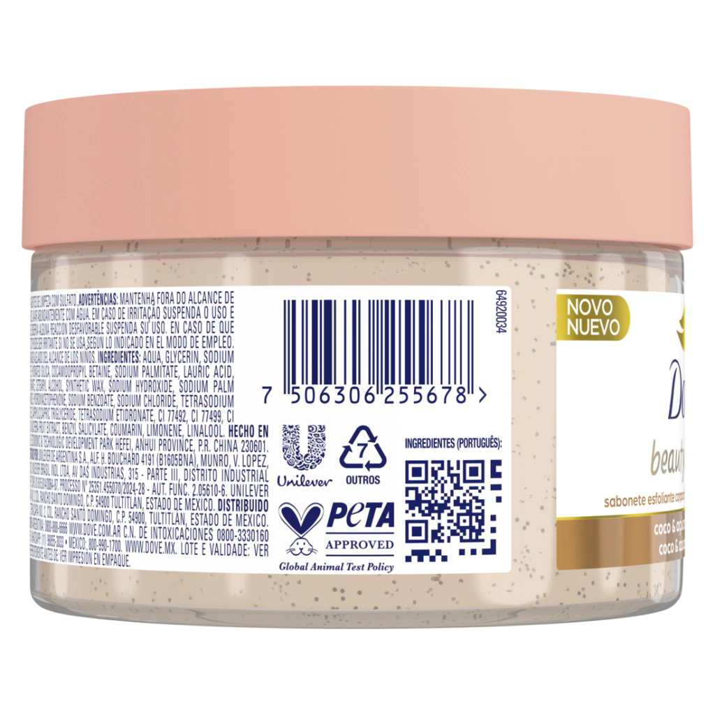 Para obter uma pele macia e radiante, a esfoliação adequada é uma etapa que não deve ser negligenciada em sua rotina. Por isso, Dove criou a nova linha de esfoliantes corporais Dove Beauty Scrub, para exaltar a beleza que há em sua pele. O Sabonete Esfoliante Corporal Dove Coco e Açúcar Mascavo, feito com ¼ de creme hidratante, remove as células mortas e impurezas, e restaura os nutrientes da pele enquanto esfolia profundamente, deixando-a macia e sedosa. Com uma textura suave e fácil de espalhar, esse sabonete esfoliante Dove esfolia, hidrata e limpa em um só passo, ao mesmo tempo em que oferece o doce aroma de coco. Obtenha uma pele saudável e renovada, com a hidratação e o cuidado que ela necessita durante o banho. Dove Coco e Açúcar Mascavo ajuda a dar um tom mais uniforme, deixando a pele suave, macia e radiante. Formulado com partículas esfoliantes de origem natural, pH neutro e 0% sulfato*, esse produto não danifica a barreira de proteção natural da sua pele.