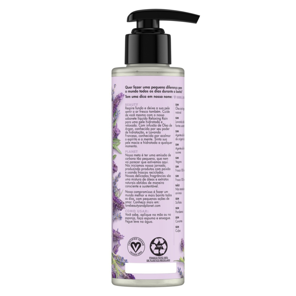 - A linha Relaxing Rain de Love Beauty and Planet, criada com óleo de argan & lavanda, para que você possa sentir-se hidratada e relaxada. - Envolva-se com todo o delicado perfume da lavanda, cultivada de forma consciente e sustentável nos campos franceses. - Esse incrível sabonete líquido, com o luxuoso óleo de argan marroquino, que te proporciona uma pele hidratada e relaxada. - Esse incrível sabonete líquido, com o luxuoso óleo de argan marroquino, que te proporciona uma pele hidratada e relaxada. - Nossos frascos não são tão transparentes, pois são feitos de plástico 100% reciclado. Eles também são recicláveis, assim causamos menos impacto no meio ambiente. - Nós acreditamos que você não precisa abrir mão de ficar bonita para cuidar do planeta. Por isso, Love Beauty & Planet incentiva suas consumidoras a fazerem pequena ações de amor pelo planeta!