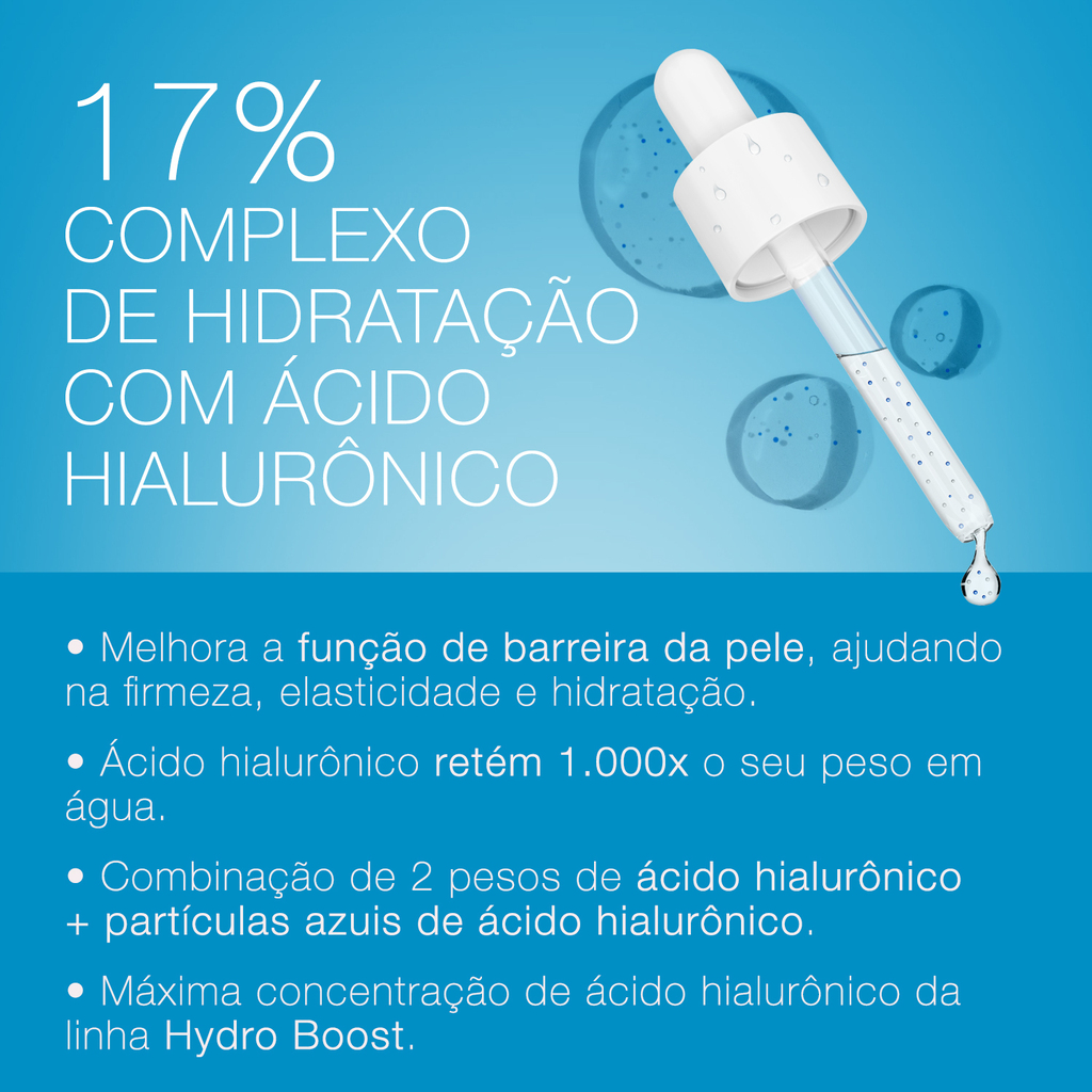 Um sérum hidratante concentrado para uso diário, com Ácido Hialurônico, Pró-Vitamina B5 e Glicerina. Hidrata intensamente e fortalece a barreira cutânea contra a perda de água, mantendo a pele macia, fortalecida e hidratada por 24 horas.