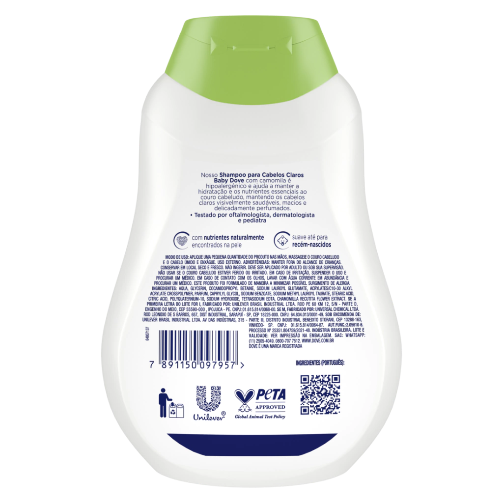 O nosso Shampoo Baby Dove para Cabelos Claros com camomila é hipoalergênico e ajuda a manter a hidratação e os nutrientes essenciais ao couro cabeludo do bebê, mantendo os cabelos claros visivelmente saudáveis, macios e delicadamente perfumados, desde o primeiro banho. Criado com pH neutro para a pele do bebê e nutrientes naturalmente encontrados na pele, esse shampoo infantil cuida do delicado couro cabeludo do seu bebê e deixa com sensação e aparência saudáveis desde seu primeiro uso. Por isso, além de limpar delicadamente, ajuda a hidratar o couro cabeludo e os fios de cabelos, mantendo-os macios e bem cuidados. Aproveite toda a hora do banho com essa cuidadosa fórmula hipoalergênica, suave e sem lágrimas do shampoo para cabelos claros com camomila. Com um perfume delicado e reconfortante desenvolvido especialmente para a pele do bebê, esse shampoo para bebês deixa os cabelos do seu pequeno saudáveis e ajuda a repor a hidratação e nutrientes essenciais com o uso.