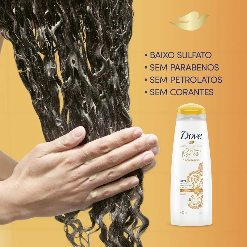 o O Shampoo Dove Texturas Reais com baixo sulfato* garante nutrição, limpeza suave e maciez aos seus cabelos cacheados