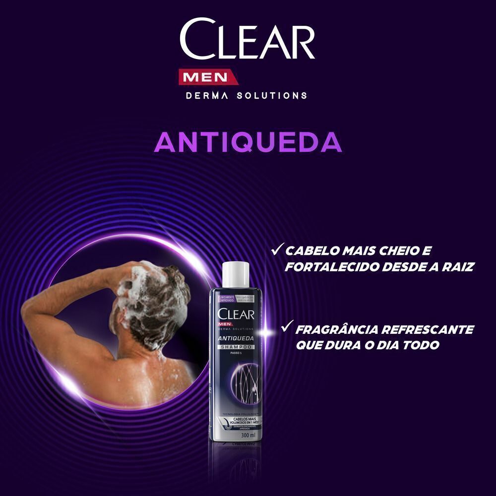 o O Shampoo Clear Men Derma Solutions Antiqueda com resultado clinicamente comprovado: reduz a queda de cabelo desde a raiz em 1 mês* o O Shampoo Clear Men Antiqueda ajuda na reconstrução capilar, resultando em cabelos mais volumosos em 1 mês* e fortalecidos desde a raiz o O Shampoo Clear Men Derma Solutions Antiqueda é dermatologicamente aprovado o Shampoo masculino antiqueda enriquecido com nutrientes que penetram no interior da fibra capilar, fortalece sua estrutura, para fios 10X mais fortes** o Sistema de tratamento antiqueda em 2 passos: Use o shampoo e o tônico capilar para melhores resultados o Conta com a tecnologia exclusiva Follilock, melhorando a fixação dos fios no couro cabeludo, aumentando a densidade capilar e reduzindo a queda dos cabelos.