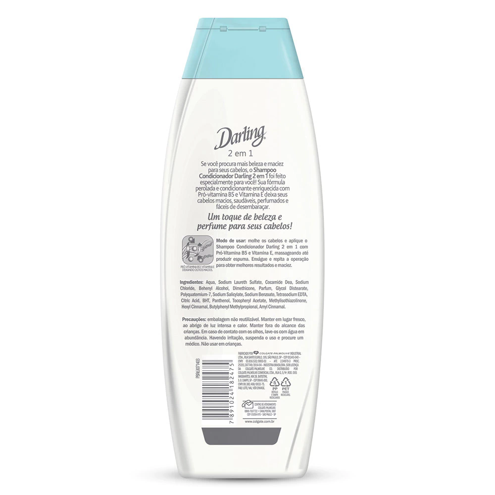 Descrição:Se você procura mais beleza e força para seus cabelos, o Shampoo Darling 2 em 1 foi feito especialmente para você! Sua fórmula perolada e condicionante enriquecida com Pró-Vitamina B5 e Vitamina E deixa seus cabelos macios, saudáveis, perfumados e fáceis de desembaraçar. Indicado para todos os tipos de cabelos. Beneficios: - Possui fórmula enriquecida com Pró-Vitamina B5 e Vitamina E; - Proporciona proteção e maciez aos fios.
