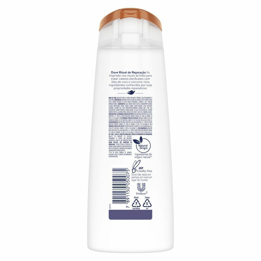 Dove Ritual de Reparação - para reparar a força de cabelos danificados e cabelos ressecados - é uma linha de produtos inspirada nos rituais de cuidados com os fios praticados pelas mulheres ao redor do mundo, combinando a nutrição de Dove com o poder da natureza. O Shampoo Dove Ritual de Reparação 300ml foi inspirada nos Rituais da Índia de tratar os cabelos danificados com óleo de coco e cúrcuma.