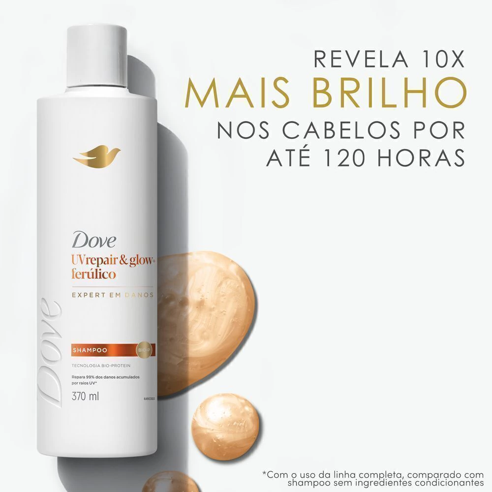 O Dove Shampoo UV Repair & Glow + Ferúlico foi desenvolvido especialmente para quem busca um shampoo com ação reparadora para danos causados pelos raios UV. A exposição contínua ao sol e aos raios UV causa perda de proteína na fibra capilar até 4x mais intensa que o calor de ferramentas térmicas, resultando em cabelos opacos, porosos e quebradiços. Com a nova e exclusiva tecnologia UV Ferúlico, Dove atua como um verdadeiro escudo contra os danos solares, reparando até 99% dos danos acumulados por raios UV*. Além disso, o Sérum Ferúlico, conhecido por seu alto poder antioxidante no cuidado facial, é agora utilizado pela primeira vez para proteger e recuperar o cabelo, oferecendo 10x mais brilho nos cabelos por até 120 horas**. Além de reparar os fios, o shampoo também devolve brilho e maciez sem pesar. Sua fragrância sofisticada, inspirada em perfumaria fina, traz notas de flores brancas, cítricos e baunilha cremosa, promovendo uma experiência sensorial marcante a cada lavagem. *Com o uso regular da linha completa. Resultados podem variar conforme o tipo de cabelo e grau de dano. Testado dermatologicamente. Produto PETA Vegan. *Danos causados por raios UV na estrutura capilar (superfície e córtex).