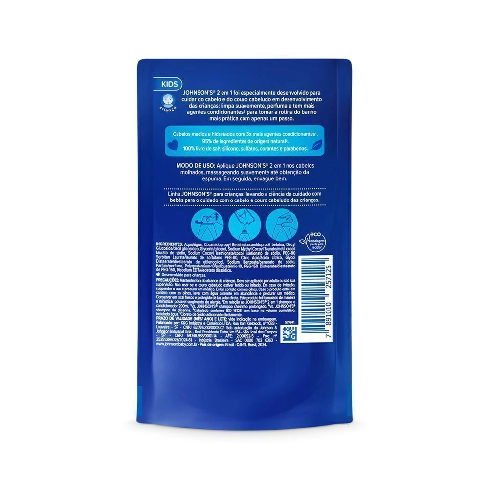 Aplique JOHNSON'S® 2 em 1 nos cabelos molhados, massageando suavemente até obtenção da espuma. Em seguida, enxague bem. Adequado para o uso diário. Indicações de uso: Para crianças de todas as idades. Composição: Aqua/água, Cocamidopropyl Betaine/cocamidopropil betaína, Decyl Glucoside/decil glicosídeo, Glycerin/glicerol, Sodium Methyl Cocoyl Taurate/metil cocoil taurato de sódio, Sodium Cocoyl Isethionate/cocoil isetionato de sódio, PEG-80 Sorbitan Laurate/laurato de sorbitano PEG-80, Citric Acid/ácido cítrico, Glycol Distearate/diestearato de etilenoglicol, Sodium Benzoate/benzoato de sódio, Parfum/perfume, Polyquaternium-10/poliquatérnio-10, PEG-150 Distearate/diestearato de PEG-150, Disodium EDTA/edetato dissódico. Precauções: Mantenha fora do alcance de crianças. Deve ser aplicado por adulto ou sob sua supervisão. Não usar se o couro cabeludo estiver ferido ou irritado. Em caso de irritação, suspender o uso e procurar um médico. Evitar contato com os olhos. Caso o produto entre em contato com os olhos, lavar com água corrente em abundância e procurar um médico. Este produto foi formulado de maneira a minimizar possível surgimento de alergia.