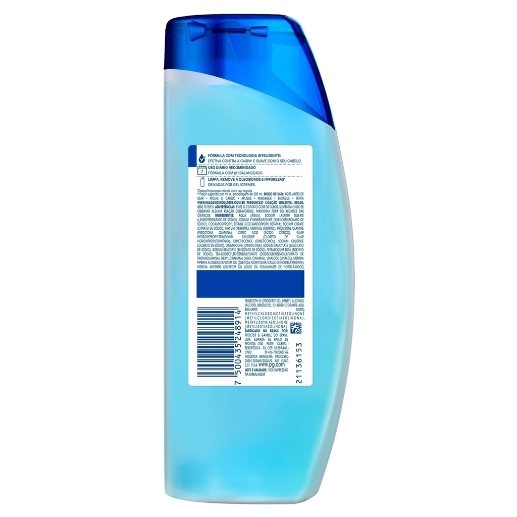 o Limpeza eficaz contra a caspa o Limpeza mais profunda com efeito duradouro o Couro Cabeludo limpo e até 100% livre de caspa* *Caspa visível, com uso regular o Experimente Head & Shoulders a marca de shampoo n° 1 do mundo*** o Sensação de limpeza o dia todo o Fórmula com tecnologia inteligente: efetiva contra a caspa* e suave com o seu cabelo. Limpa, remove oleosidade e impurezas. *Caspa/impurezas visíveis, com uso regular o USO DIÁRIO RECOMENDADO Fórmula com pH balanceado o LIMPA, REMOVE A OLEOSIDADE E IMPUREZAS Deixadas por gel/cremes