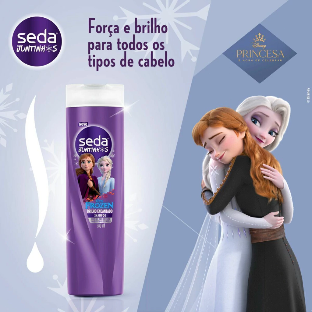 o Shampoo Congelado Brilho Encantado. o Força e briho para todos os tipos de cabelo. o O Shampoo Seda Juntinhos limpa e dá mais força e brilho aos fios, deixando-os mais fáceis de pentear e com um cheirinho delicioso! o Seda não testa em animais. o * Com o uso do shampoo e condicionador Seda Juntinhos Frozen em comparação com shampoo sem agentes condicionantes o ** inclusão de pelo menos 39% de plástico reciclado.; o * Nossa garrafa é feita com plástico reciclado ** e é 100% reciclável
