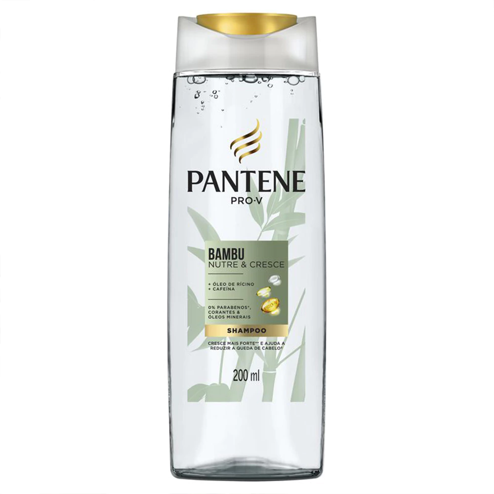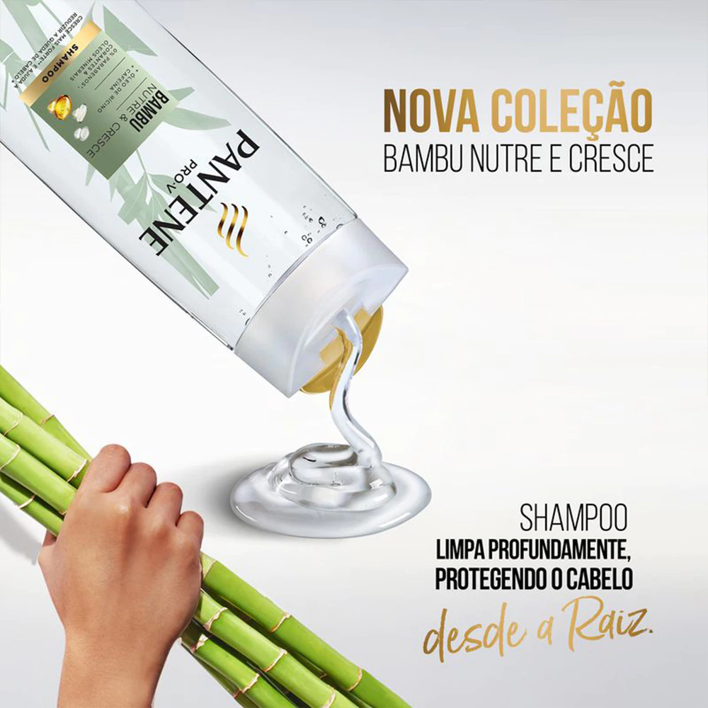A coleção Pantene Bambu Nutre e Cresce foi criada para ajudar no ciclo da quebra de cabelo, nutrindo desde as raízes, para o cabelo crescer mais forte. Esse Shampoo transparente limpa profundamente ao mesmo tempo que protege a estrutura do cabelo. Com extrato de bambu, óleo de rícino e cafeína. Contém 0% de parabenos, corantes e óleos minerais. O poder de combate à quebra de Pantene Bambu está disponível em produtos de toda a linha, shampoo, condicionador, creme para pentear, máscara nutritiva. Agora, você pode combater a quebra porque um Cabelo Pantene diz meu crescimento não tem limites! · Nutrição desde à raiz, para seu cabelo crescer forte e mais resistente· Ajuda a reduzir a queda de cabelo· O bambu é mais forte que madeira, concreto e aço e pode ser flexível com o vento, sem quebrar· O óleo de rícino, que é rico em ômega 9, tem poder hidratante e pH balanceado· A cafeína, conhecida por promover regeneração celular, também melhora a circulação sanguínea· Uma nova fragrância que transmitirá uma sensação de natureza, com um aroma inspirado nas florestas de bambu· Queda causada pela quebra dos fios