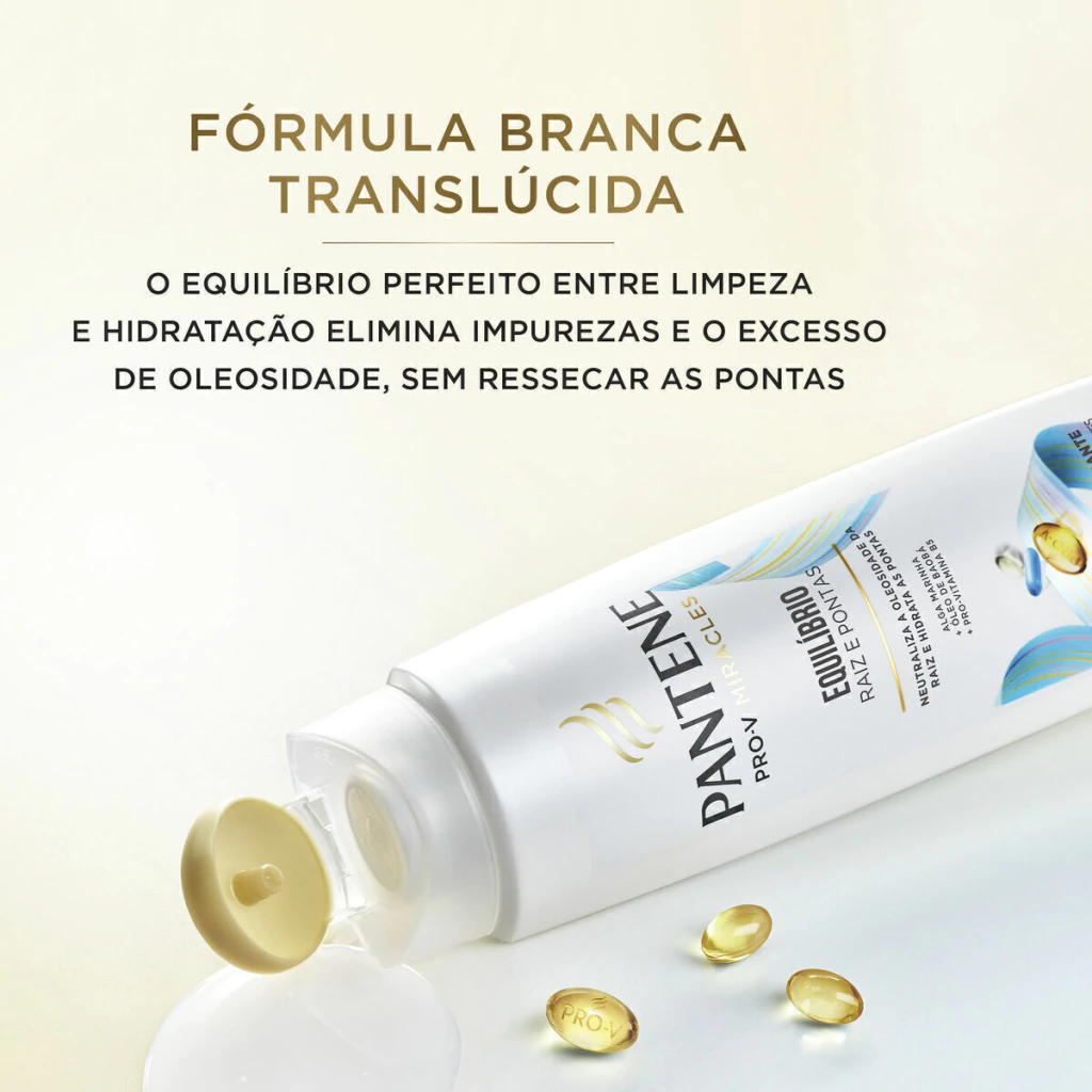 Você sente que tem dois cabelos em um? Já tentou de tudo para remover a oleosidade e resíduos da raiz dos seus cabelos sem deixar as pontas ainda mais secas? Então o Shampoo Pantene da coleção Equilíbrio Raiz e Pontas com óleo de baobá e algas marinhas é ideal para você. Seu complexo Pro-V Miracle penetra profundamente nos fios equilibrando os cabelos mistos, com pontas ressecadas ou espigadas, purificando as raízes oleosas e eliminando as impurezas e resíduos de produtos. Além disso, sua fórmula com ingredientes hidratantes e purificantes é segura para cabelos com luzes, pois limpa suavemente, equilibrando a oleosidade da raiz para cabelos mais soltinhos, frescos e brilhosos. Mergulhe nas sensações de exuberância, pureza e leveza de coração com a fragrância repleta de notas alegres de laranja, toranja e groselha e notas florais com uma pitada de água de coco que vão transportar você para uma experiencia inesquecível. A coleção Pantene Equilíbrio Raiz e Pontas elimina a oleosidade da raiz e hidrata as pontas.