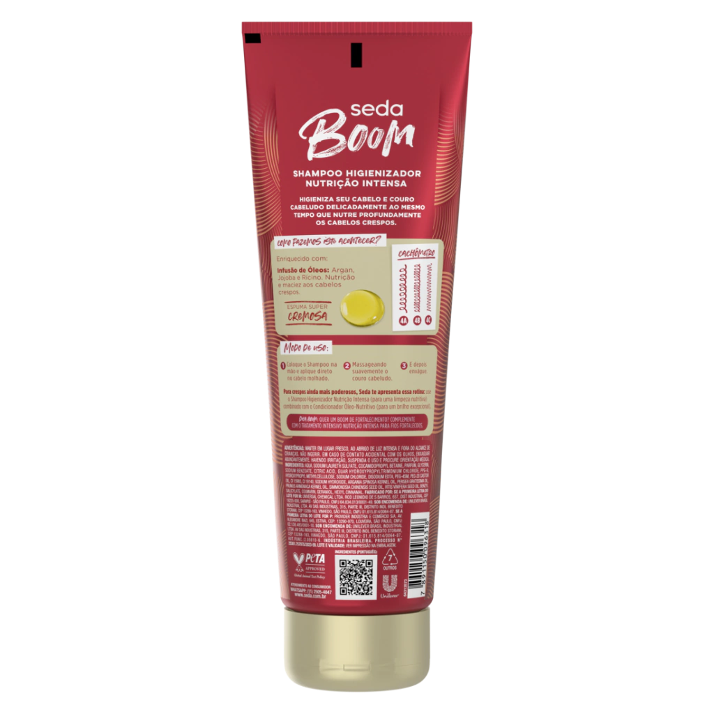 Seda Boom surpreende-nos com este novo shampoo higienizador para o poder do crespo! O Shampoo Seda Boom Nutrição Intensa limpa delicadamente os cabelos e o couro cabeludo enquanto nutre intensamente os fios. Este shampoo é enriquecido com uma infusão de óleos: argan, jojoba e rícino, que promove nutrição e maciez aos cabelos crespos. Esta fórmula, com espuma super cremosa, vai deixar seus fios profundamente nutridos e macios como eles merecem! Esse shampoo é livre de parabenos e óleo mineral em sua composição. Com a Linha Seda Boom você escolhe seu shampoo de acordo com a finalização que deseja, afinal, sejam os seu cabelo com cachos, cabelo cacheado ou cabelo ondulado, você é livre para se expressar como quiser. Dicas de finalização: 1. Coloque o Shampoo na mão e aplique direto no cabelo molhado. 2. Massageando suavemente o couro cabeludo. 3. E depois enxágue. Para crespos ainda mais poderosos, Seda te apresenta essa rotina: use o Seda Boom Shampoo Higienizador Nutrição Intensa, para uma limpeza nutritiva, combinado com o Condicionador Óleo-Nutritivo, para um brilho excepcional. Dica Boom: quer um Boom de fortalecimento? Complemente com o Tratamento Intensivo Nutrição Intensa para fios fortalecidos. Seda possui a certificação PETA, o que significa que não testa seus produtos em animais.