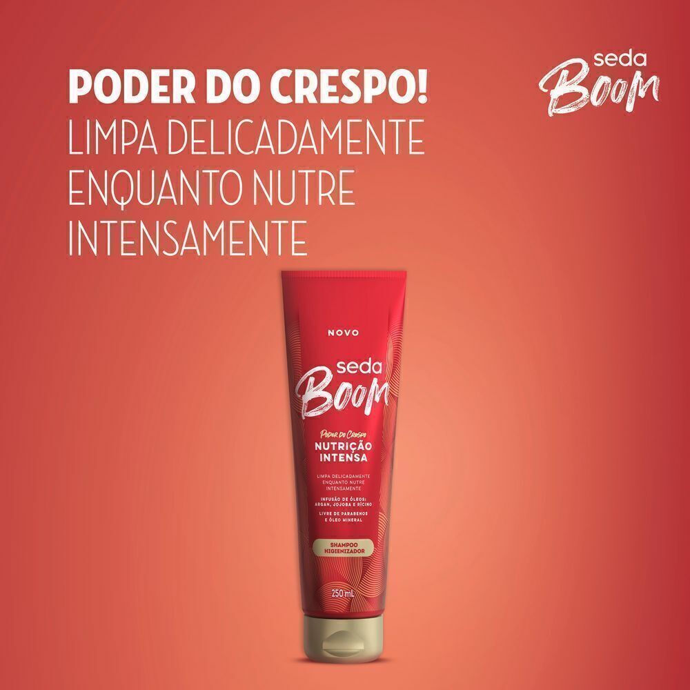 oO Shampoo Seda Boom Nutrição Intensa é o novo shampoo higienizador que limpa delicadamente enquanto nutre intensamente oA fórmula desse shampoo é enriquecida com uma infusão de óleos: argan, jojoba e rícino, que promove nutrição e maciez aos cabelos crespos oShampoo que higieniza seu cabelo e couro cabeludo delicadamente ao mesmo tempo que nutre profundamente os fios oEste shampoo higienizador Seda Boom possui uma espuma super cremosa para uma limpeza delicada e nutrição dos cabelos oEsse shampoo é ideal para cabelo crespo, e é livre de parabenos e óleo mineral oO Shampoo Seda Boom Nutrição Intensa deixa seu cabelo crespo incrivelmente macio