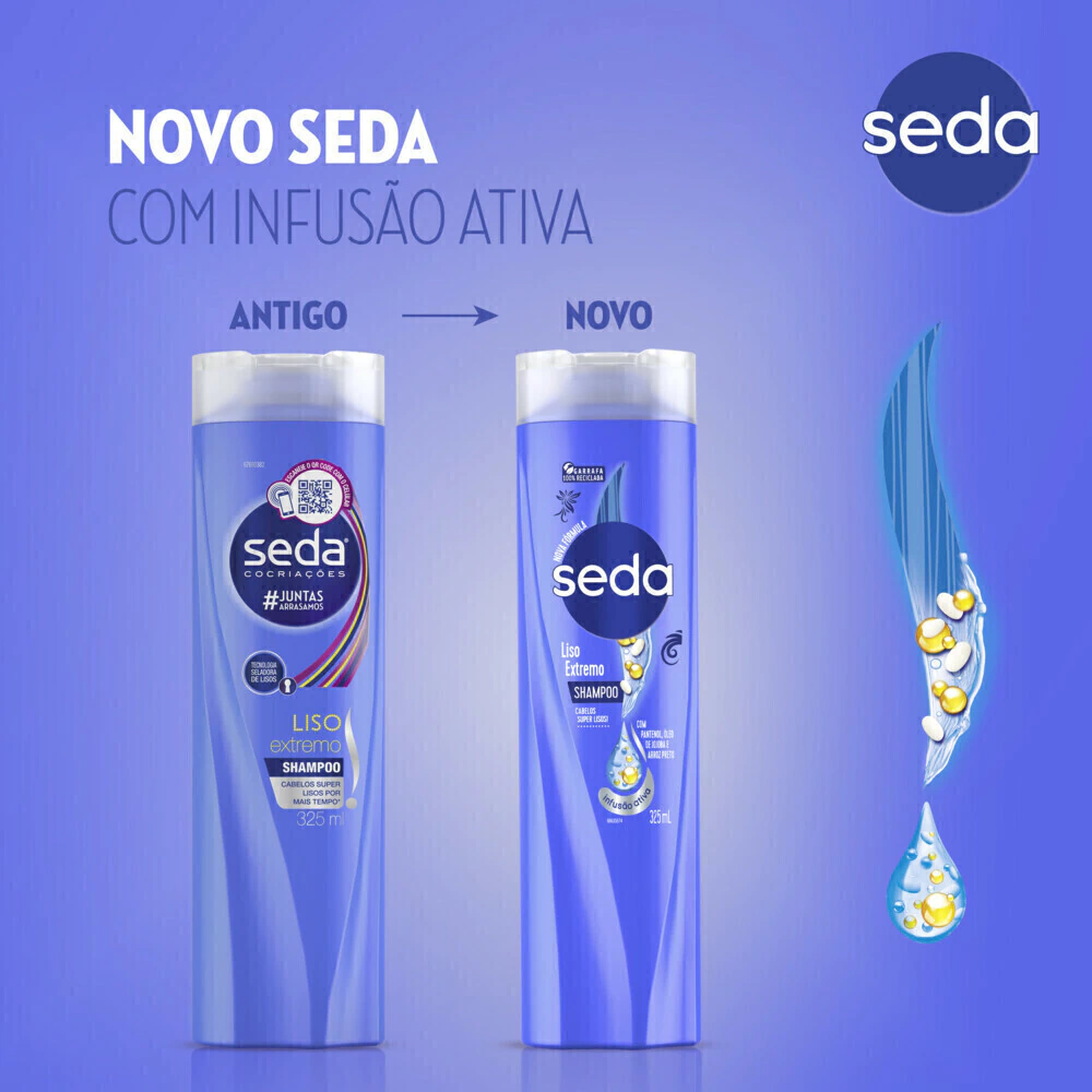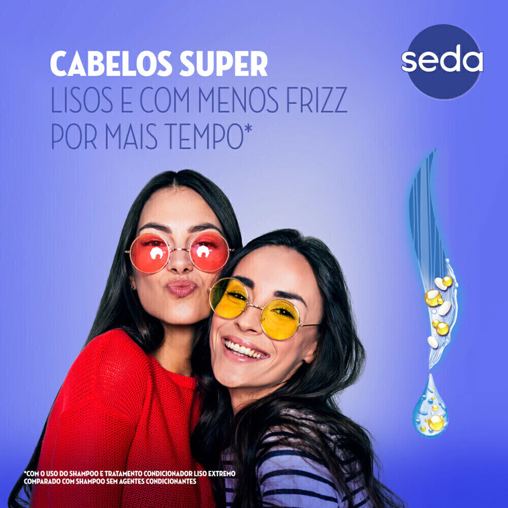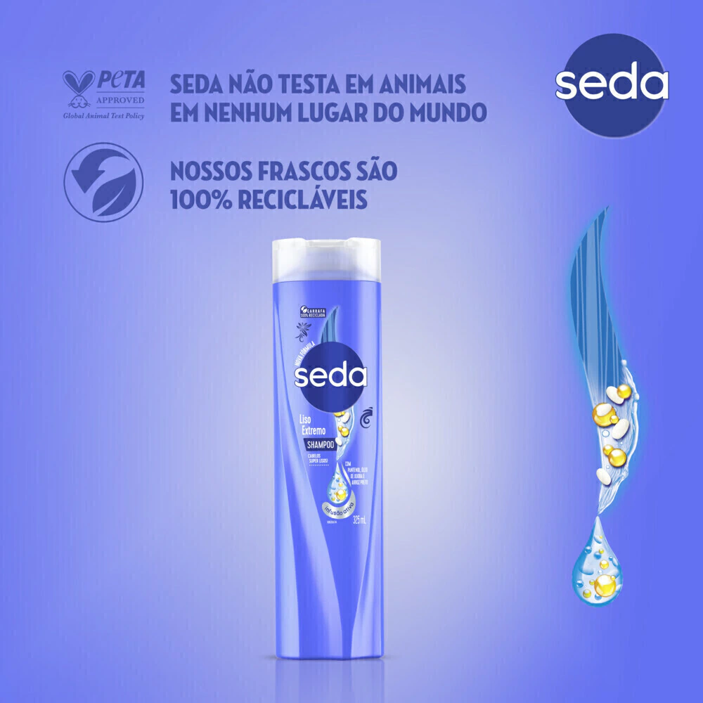 o Shampoo Seda que possui fórmula exclusiva com a tecnologia Seladora de Lisos. o Shampoo Seda Liso Extremo dá definição aos fios. o Menos frizz por mais tempo. COM USO DE SHAMPOO E CONDICIONADOR COMPARADO COM SHAMPOO SEM AGENTES CONDICIONANTES. o Cabelos alinhados. o Shampoo para cabelo liso, alisado, desalinhado e com frizz. o O Shampoo Seda Liso Extremo pode ser usado diariamente.